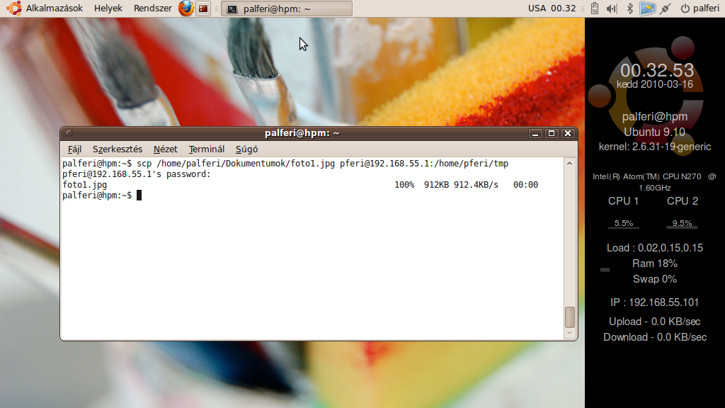 palferi@hpmp ~$ scp /home/palferi/Dokumentumok/foto1.jpg pferi@192.168.4.4:/home/pferi/tmp |
