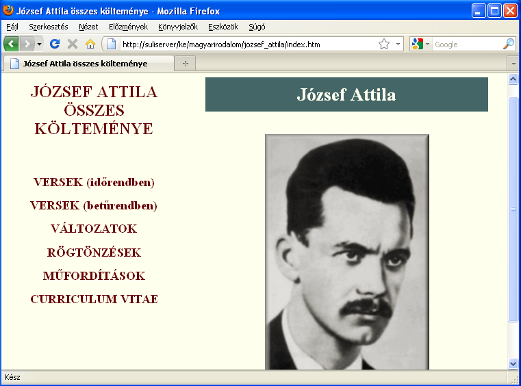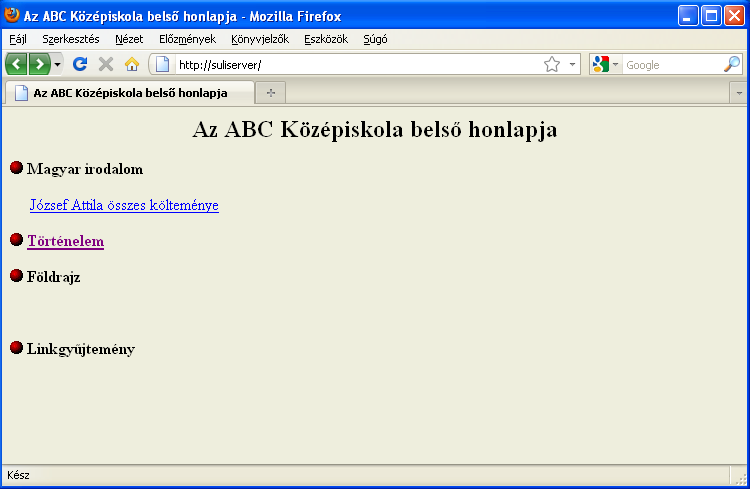 <html> <head> <content="text/html; charset=UTF-8"> <title>Az ABC Középiskola belső honlapja</title> </head> <body bgcolor="#EEEEDD"> <p align="center"><b><font size="5">Az ABC Középiskola belső honlapja</font></b></p> <p><img src="g1.gif"><b> Magyar irodalom</b></p> <p> <a href="ke/magyarirodalom/jozsef_attila/index.htm"> József Attila összes költeménye</a></p> <p><img src="g1.gif"><b> <a href="ke/tortenelem"> Történelem</a></b></p> <p><img src="g1.gif"><b> Földrajz</b></p> <p> </p> <p><img src="g1.gif"><b> Linkgyűjtemény</b></p> <p> </p> </body> </html> |