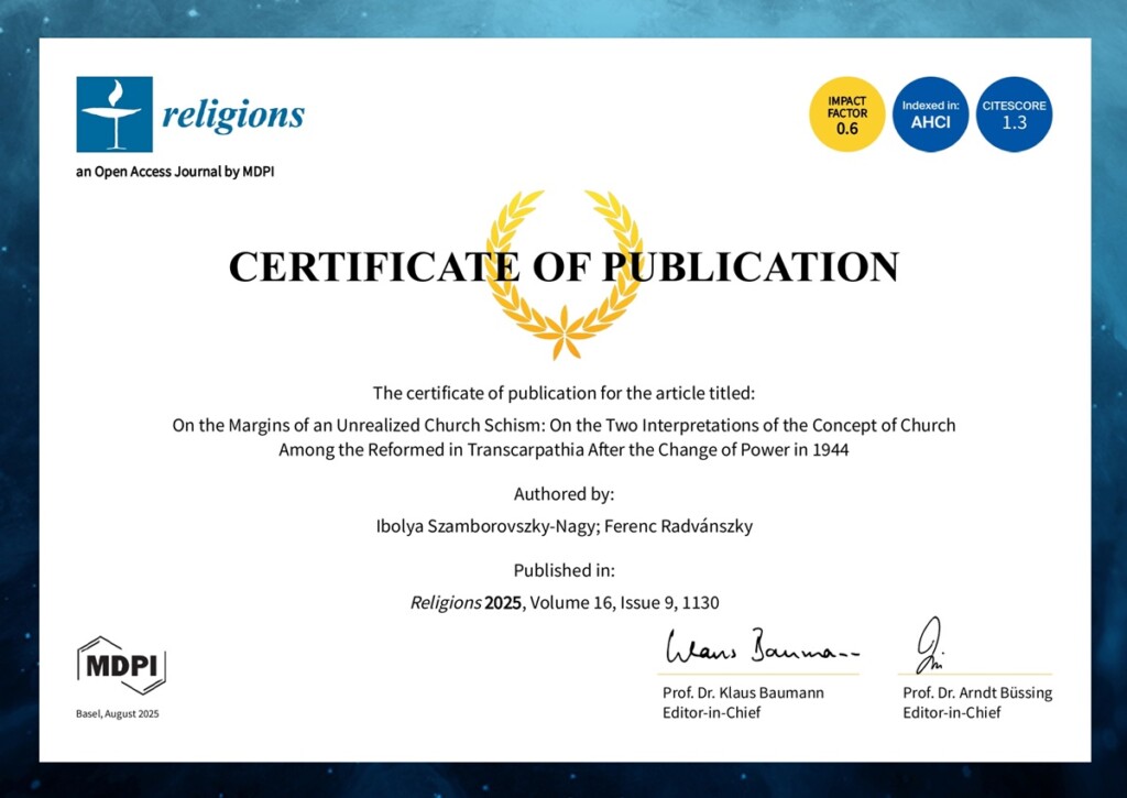 The Swiss journal Religions, ranked Q1 by Scopus, published a special issue in September 2025 featuring a study by Ibolya Szamborovszky-Nagy and Ferenc Radvánszky titled “On the Margins of an Unrealized Church Schism: On the Two Interpretations of the Concept of Church Among the Reformed in Transcarpathia After the Change of Power in 1944”: https://www.mdpi.com/2077-1444/16/9/1130