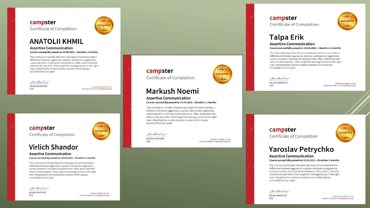 Assertive communication is an effective tool for building positive relationships with people around you and achieving common goals. Assertive communication skills contribute to developing an automatic assertive communication style. With the help of practice, tasks and examples from everyday life, students of higher education have acquired skills that will help them confidently voice their thoughts, feelings and desires, directly and with dignity, while always respecting their rights and the rights of others. The acquired additional competencies will contribute to better career growth and the achievement of the highest professional positions, as assertiveness makes it possible to successfully make decisions and, at the same time, set one’s limits with respect for others.