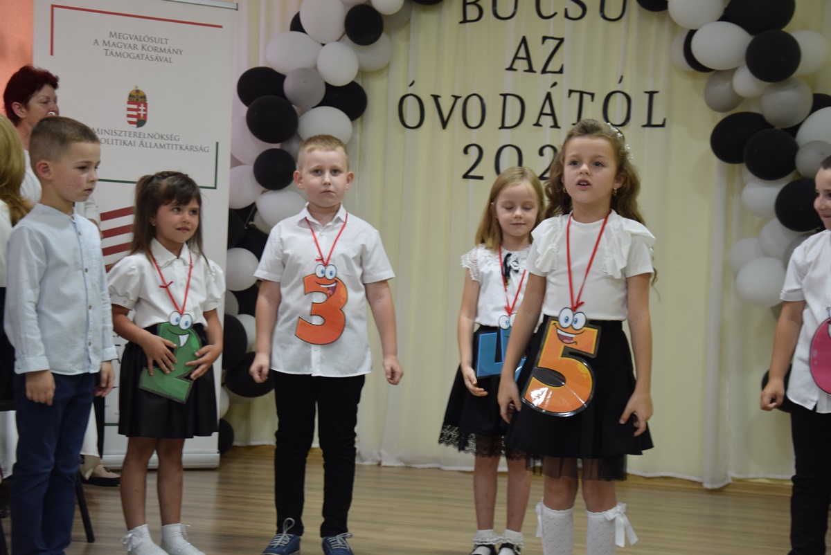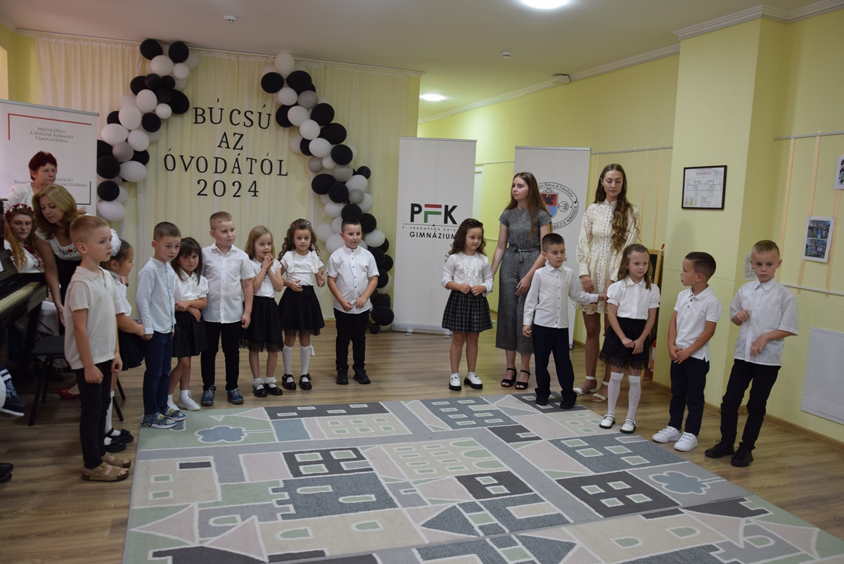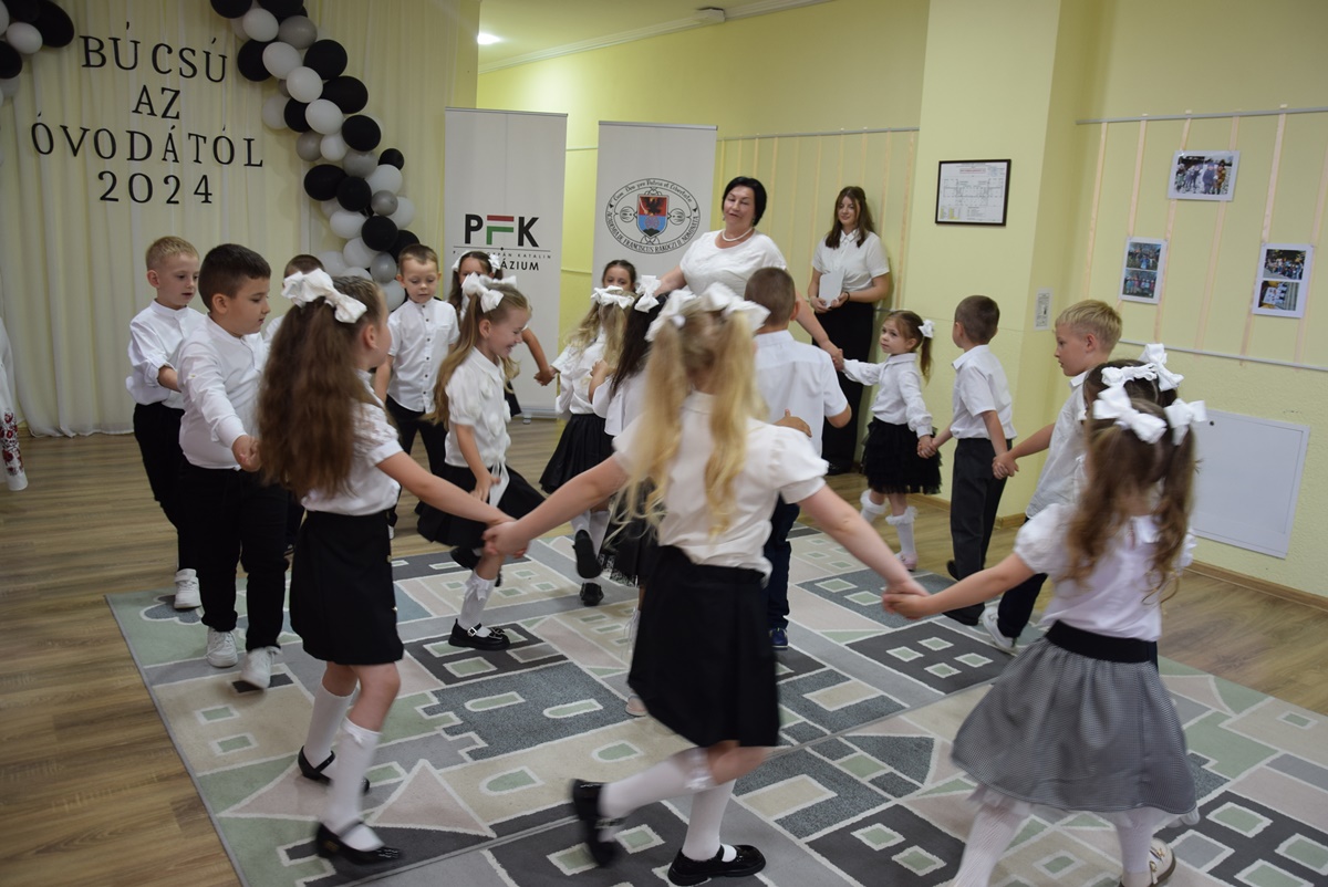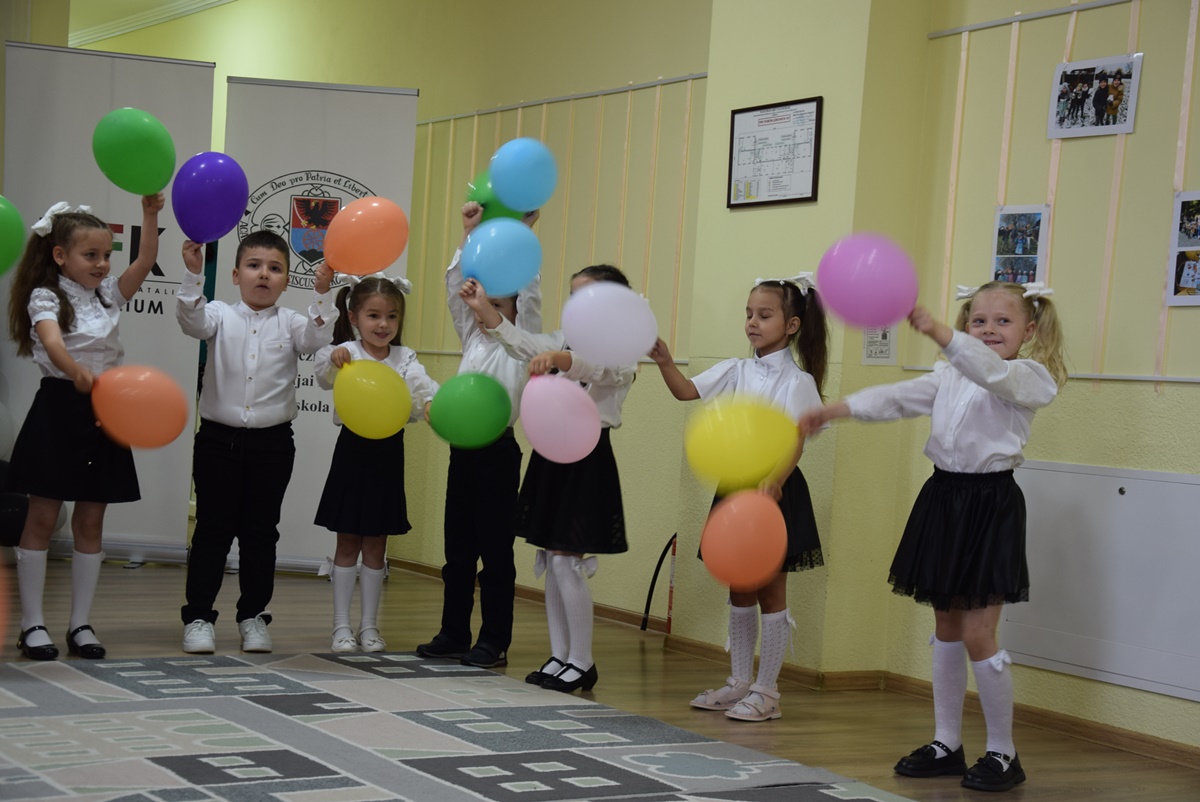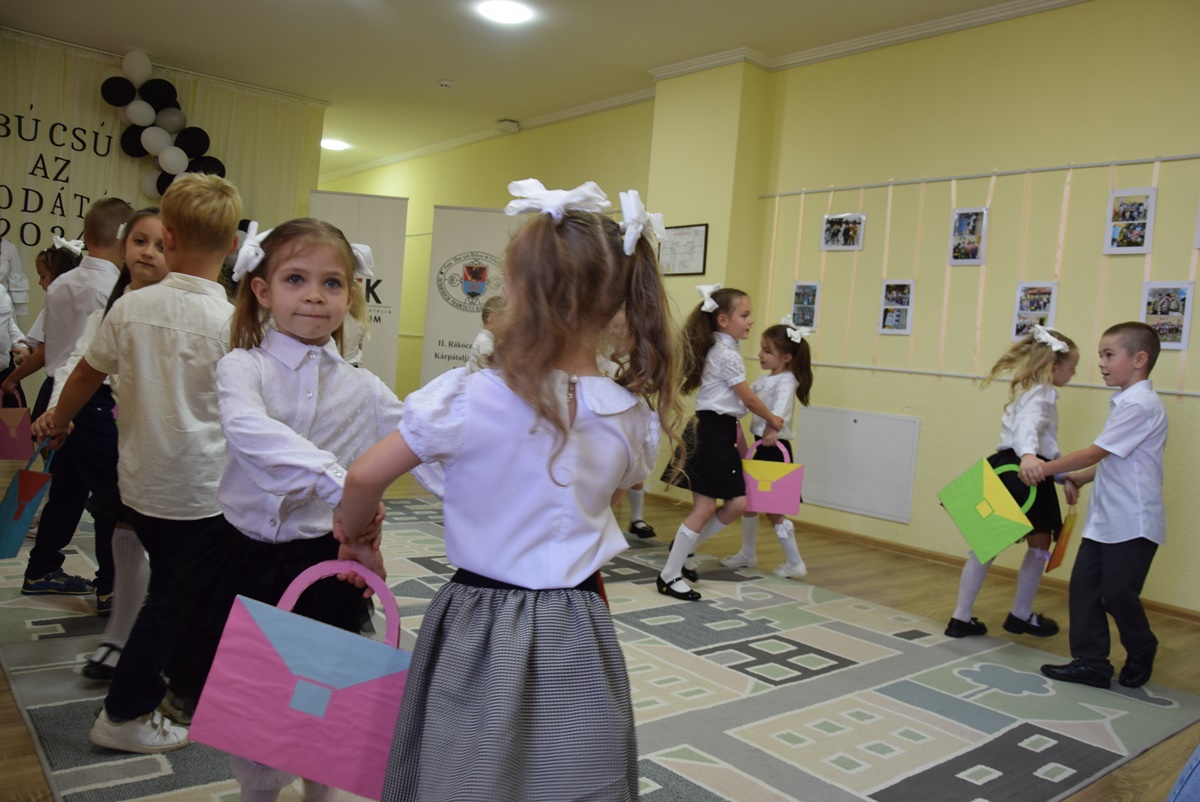After the greetings, it was the children’s turn to shine. The 16 pupils of the Mókuska Group, led by their teachers Klára Hladonik and Éva Molnár, presented a musical and dance program showcasing what they had learned over the past years – poems, songs and rhymes. Under the guidance of Gabriella Szilágyiné Tóth, a folk game instructor from the Tulipán Tanoda, they performed folk songs and games. Emese Virág’s “Szolomijka” Ukrainian language and Katalin Rácz’s “Mary Poppins” English language sessions had so endeared these languages to the children that they also performed Ukrainian and English songs and games on stage. Finally, the children received gift packages and certificates from Ildikó Orosz, president of the Ferenc Rakoczi II Transcarpathian Hungarian College of Higher Education, Andzselika Bedő, director of the P. Katalin Frangepán Grammar School and Andrea Jakab, acting director of the P. Katalin Frangepán Grammar School.