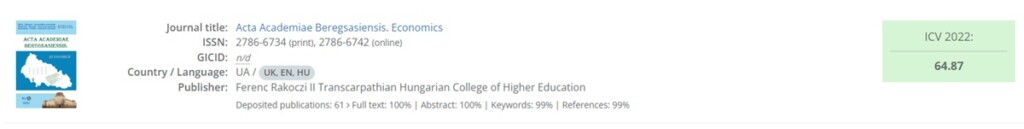 Journal “Acta Academiae Beregsasiensis. Economics” has been indexed in the scientometric database Index Copernicus International (ICI)