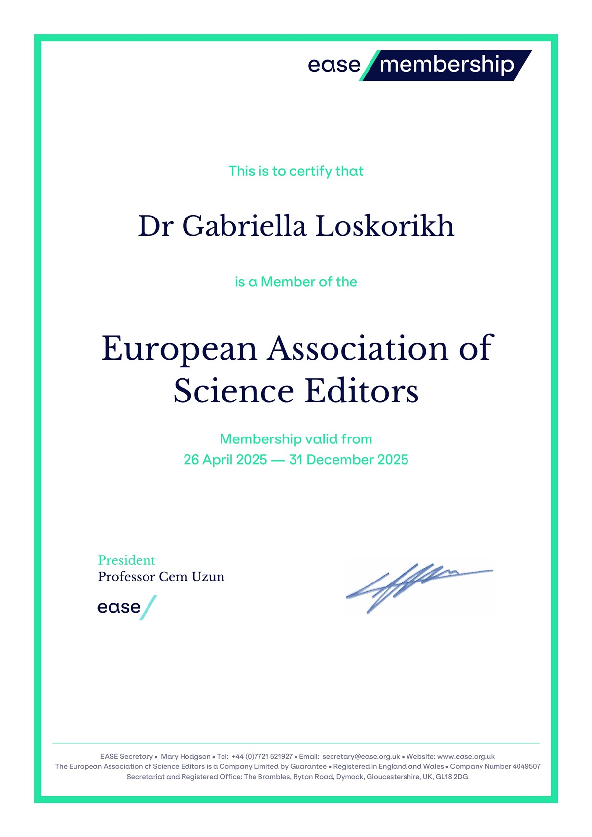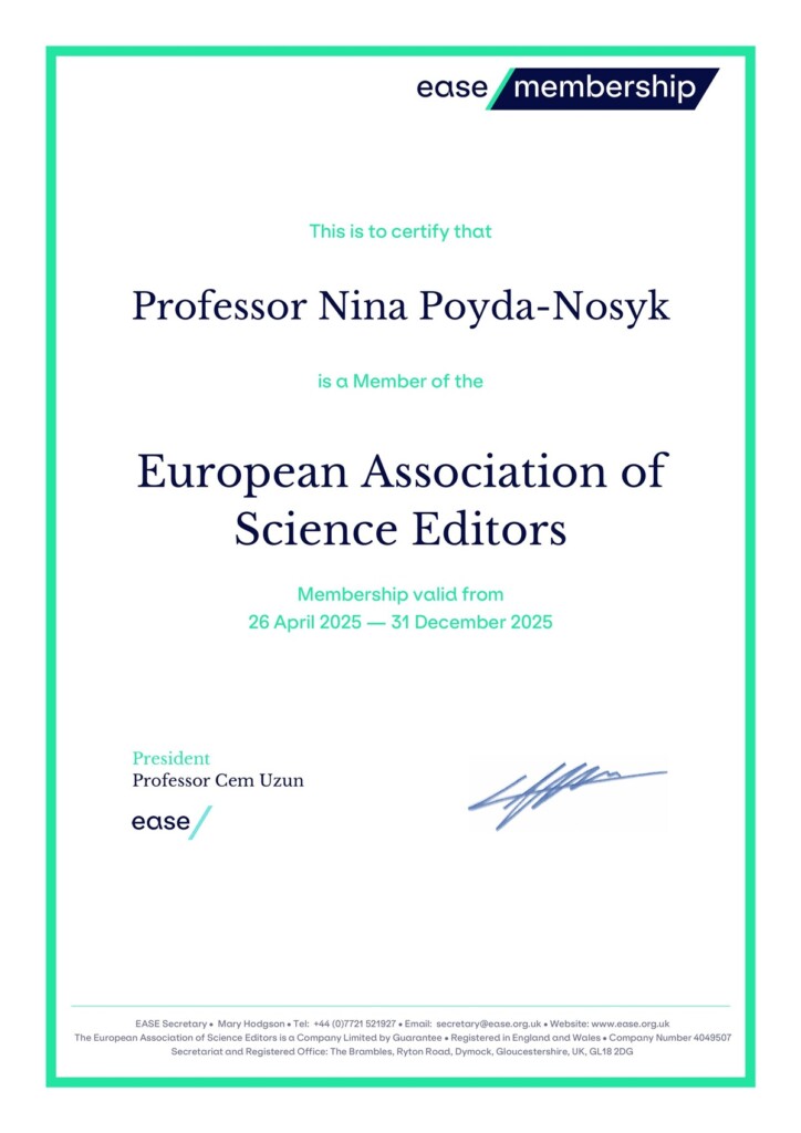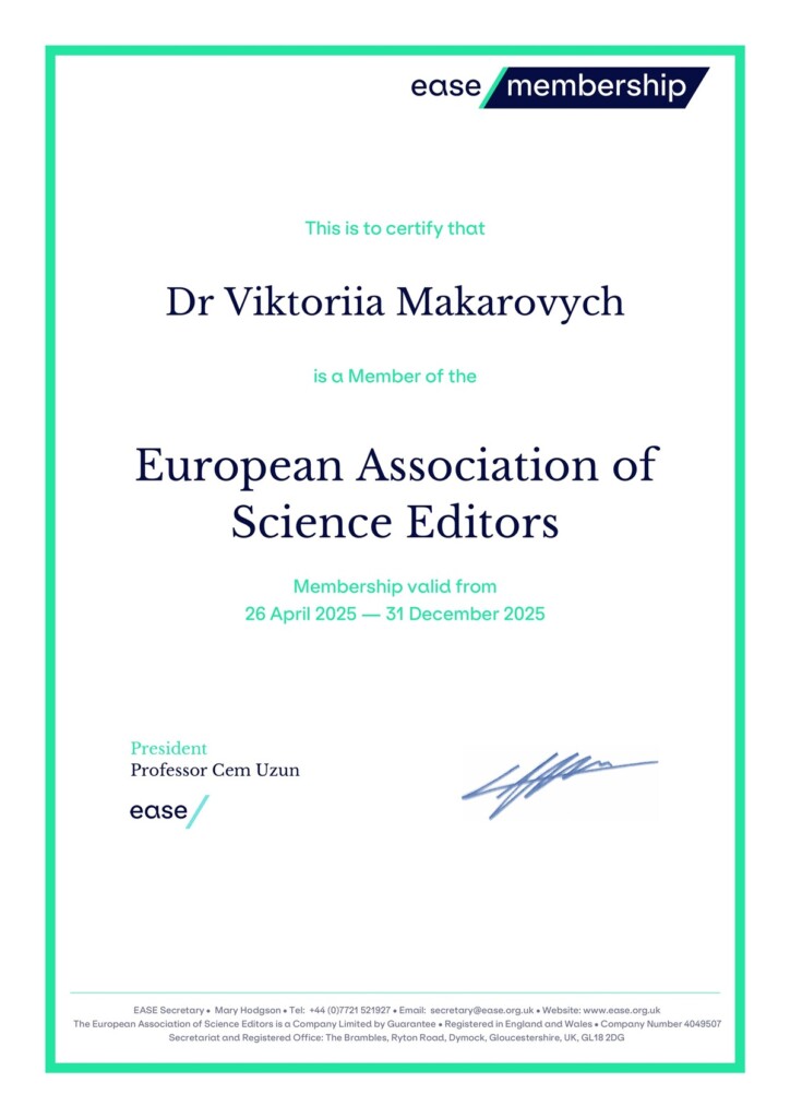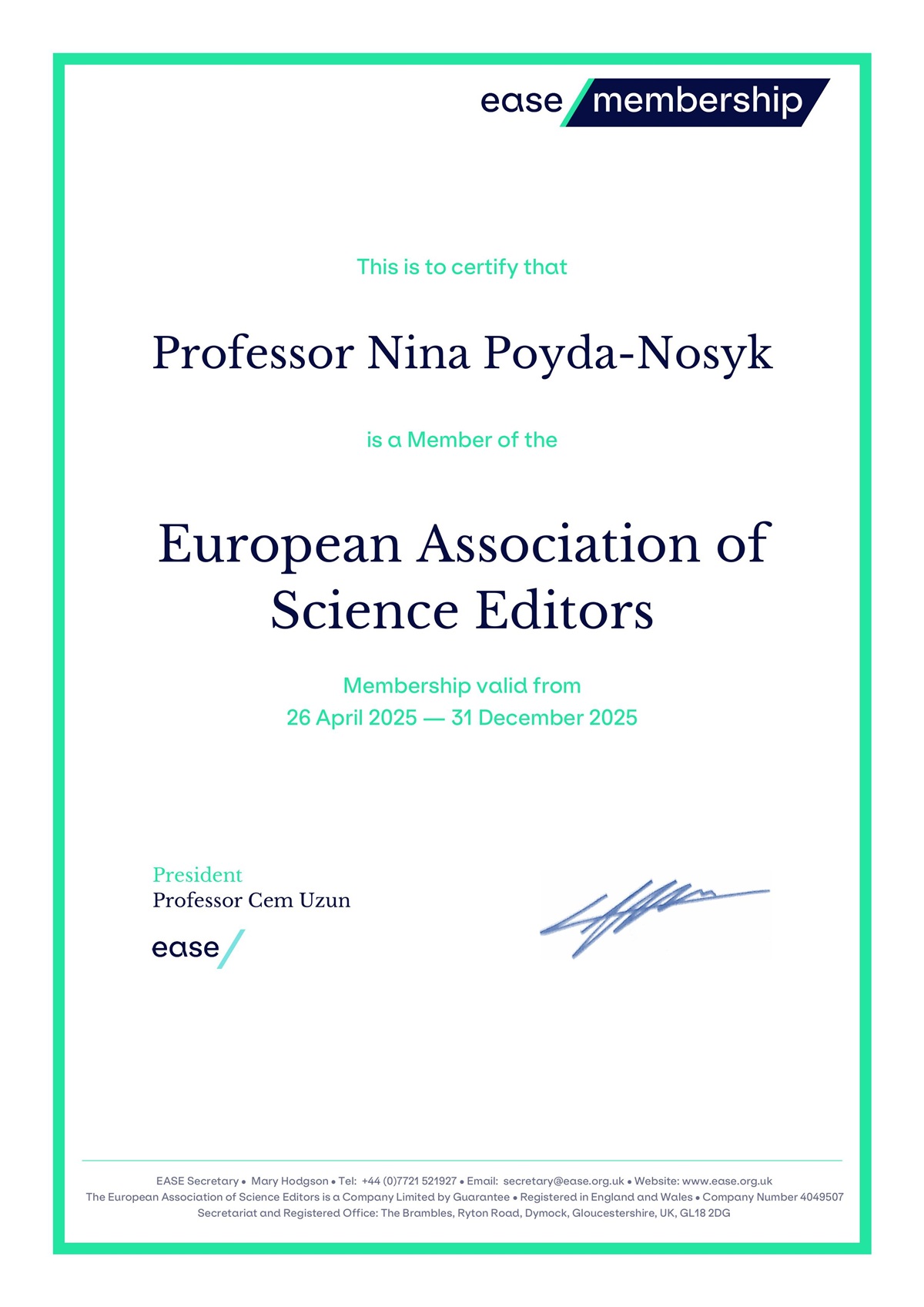 Membership in EASE is a testament to the high professional level of the Editorial Board and opens up new opportunities for international scientific collaboration, enhancing the quality of publications, and implementing ethical standards in publishing activities.