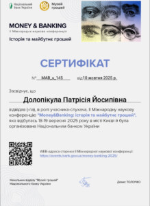 Students, within the framework of the activities of the Scientific Group «Research of accounting, financial and economic aspects of functioning of economic entities at the micro, meso and macroeconomic levels» supervised by dr. Gabriella Loskorikh and dr. Kateryna Sochka) and as part of studying the courses «Money and Credit» and «Finance, Money and Credit», joined as online participants the ІІ International Scientific Conference «Money & Banking: The History and the Future of Money», organized by the National Bank of Ukraine on September 18–19, 2025.