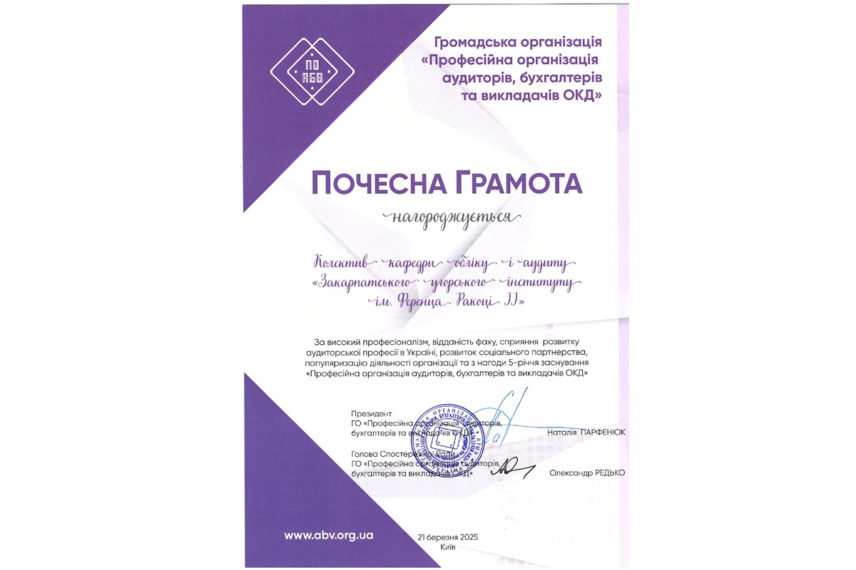 On March 21, 2025, the Department of Accounting and Auditing of the Ferenc Rákóczi II Transcarpathian Hungarian College of Higher Education was awarded an honorary certificate by the Public Organization “Professional Organization of Auditors, Accountants and Educators of OKD”.
