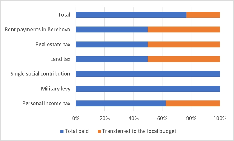 In the total amount of taxes and fees paid by the FRII THCHE, the largest share falls on personal income tax (46%) and the single social contribution (47%). The latter is fully sent to the state budget and does not remain in place. At the same time, 60% of personal income tax remains at the level of the local budget. Deducted amounts of this tax make up 91.4% of all obligatory payments paid by the Institute to the budget of the Berehivska UTC. The distribution of taxes and fees paid by the Institute by budget levels is presented in the figure.