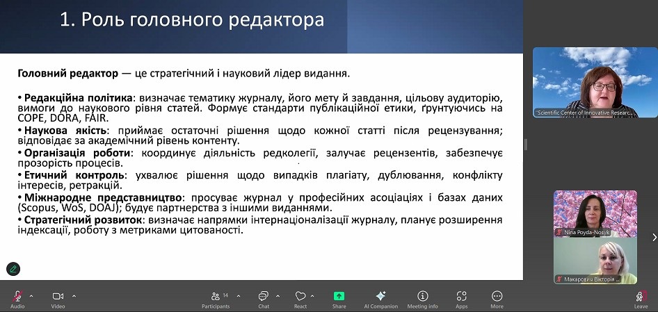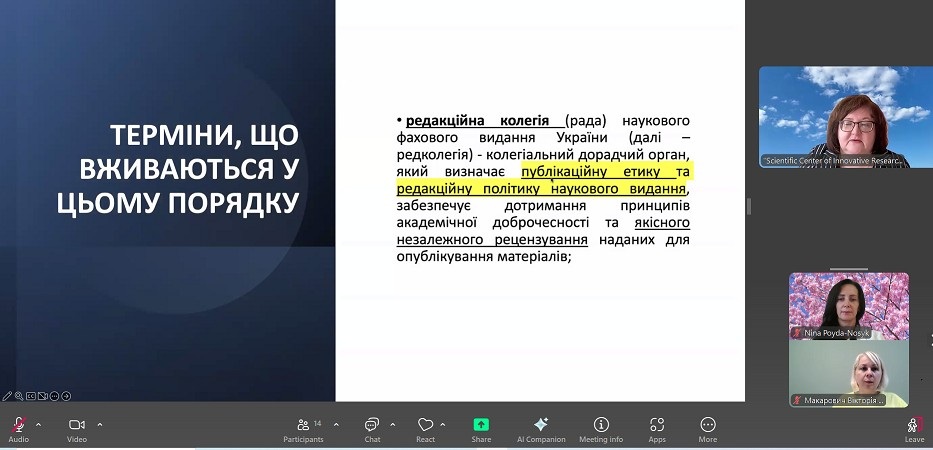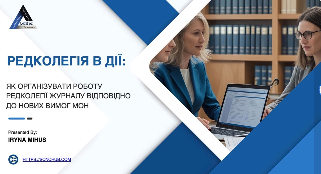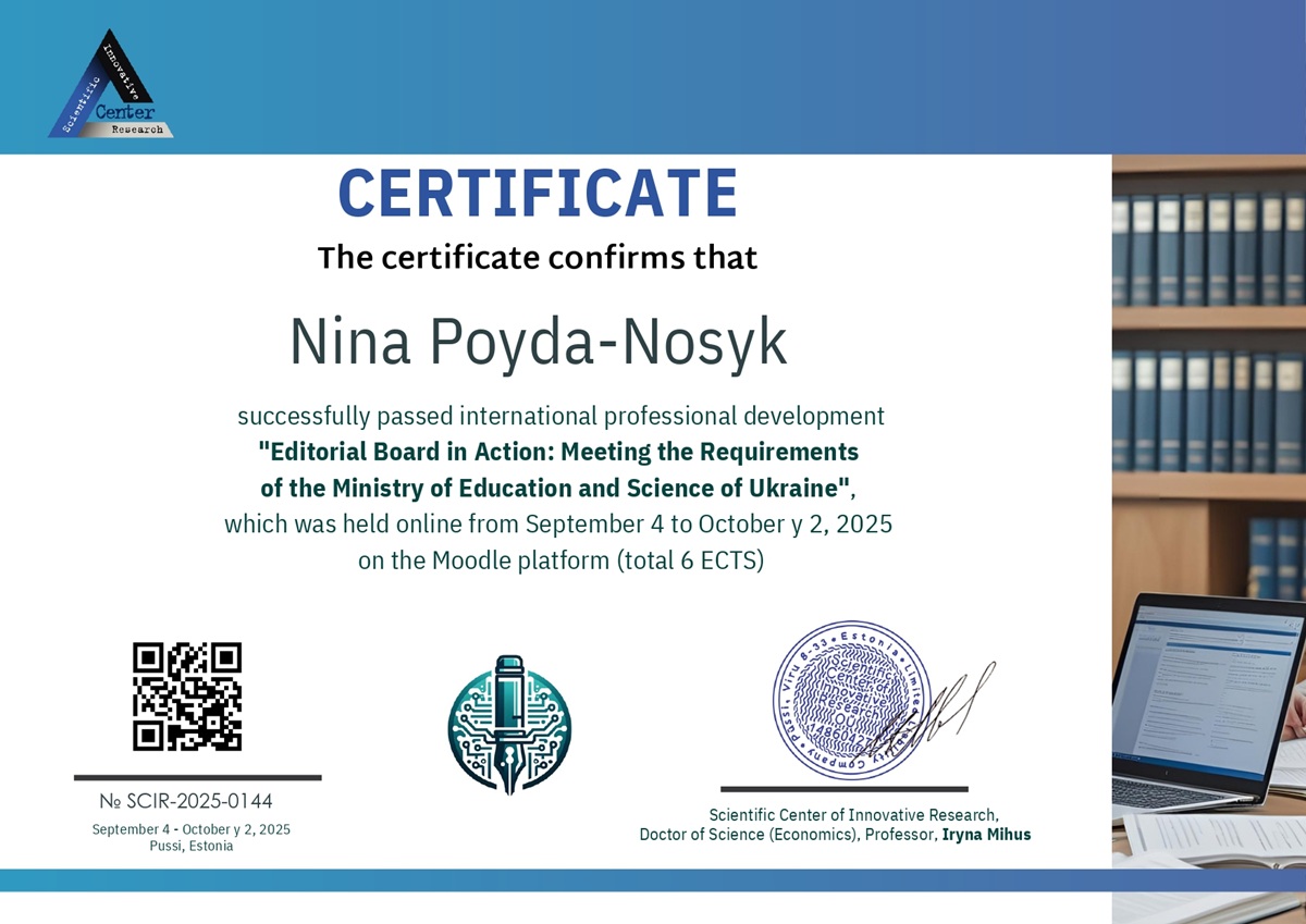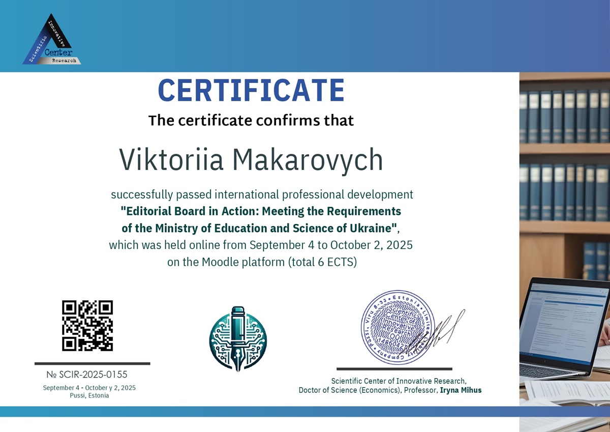 The event, organized by the Scientific Center for Innovative Research (Estonia) under the leadership of Doctor Economic Sciences, Professor Iryna Migus, was aimed at enhancing the professional competence of editorial board members of scientific journals and ensuring compliance of editorial practices with international standards.