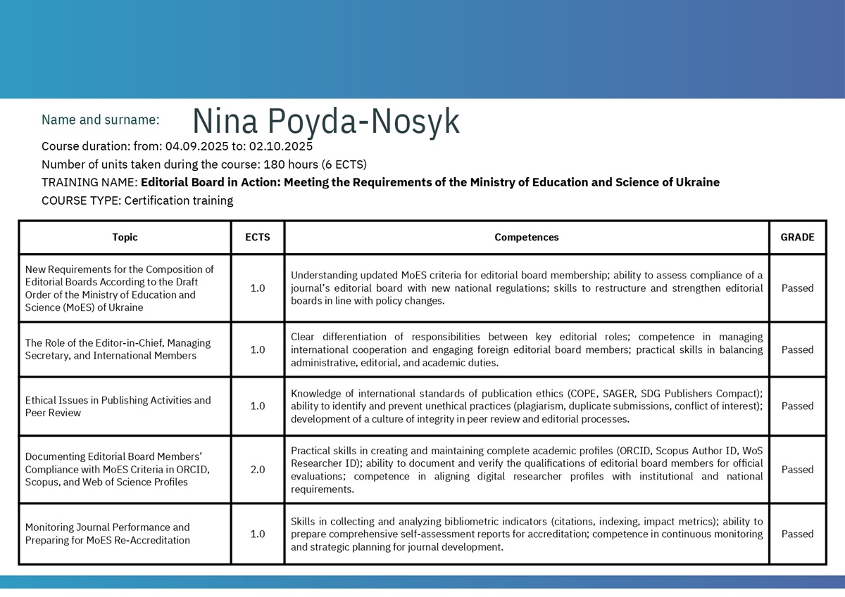 During the course, participants explored new approaches to forming editorial boards, including criteria for selecting Ukrainian and foreign members, requirements for their academic activity, and proper documentation of their professional profiles in ORCID, Scopus, and Web of Science. Special attention was devoted to defining the roles and responsibilities of the editor-in-chief, managing editor, and international members; establishing effective communication among the editorial office, authors, and reviewers; and implementing modern practices of editorial management aligned with international standards.