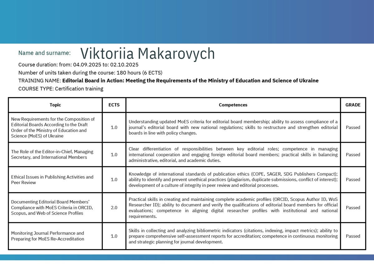 From September 4 to October 2, 2025, representatives of the Editorial Board of the scientific journal Acta Academiae Beregsasiensis. Economics – Dr. Nina Poyda-Nosyk, Professor, Doctor of Economics, and Dr. Viktoria Makarovych, Associate Professor, Doctor of Economics – participated in the international professional development course “The Editorial Board in Action: How to Organize the Work of a Journal’s Editorial Board in Accordance with the New Requirements of the Ministry of Education and Science.”