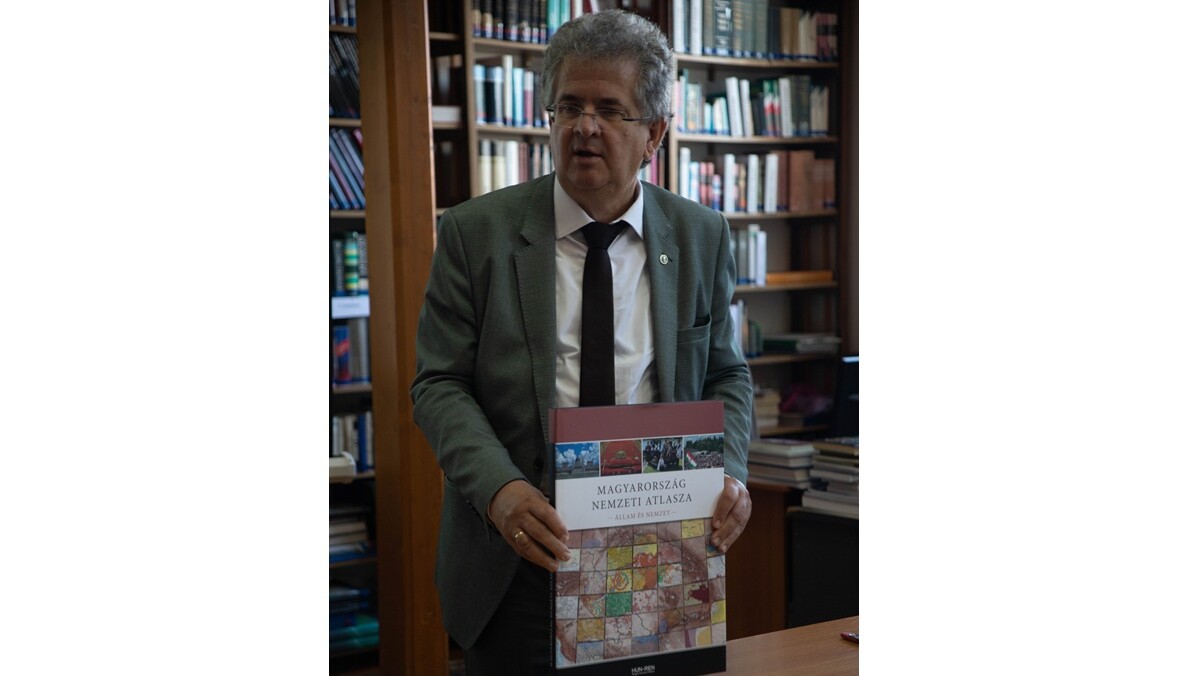 Ezt követően megtartotta Magyarország Nemzeti Atlasza – Állam és Nemzet című előadását, melyen részletesen bemutatta a kötetet. Elsőként megismerhettük a nemzeti atlaszok főbb jellemzőit. Megtudhattuk, hogy a nemzeti atlasz egy-egy ország, nemzet „személyi igazolványa”, a zászló, a címer és a himnusz mellett a legfontosabb nemzeti jelképek egyike. Ezt követően kitért a Magyarországot bemutató nemzeti atlaszok előzményeire, melyen láthattuk a legrégibb nyomtatott országtérképünket (Lázár-térkép, 1528). A továbbiakban az előadó tisztázta a Kárpát-medence és a Pannon-medence fogalmakat, valamint bemutatta az atlasz egyes fejezeteit, melyek a honfoglalás előtti és utáni időszakokat ölelik fel, megismertetve a közigazgatással, a magyar népi kultúrával, a magyar nyelvjárásokkal, a választási földrajzzal.