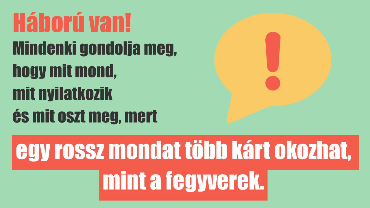 Háború van! Mindenki gondolja meg, hogy mit mond, mit nyilatkozik és mit oszt meg! Egy rossz mondat több kárt okozhat, mint a fegyverek.