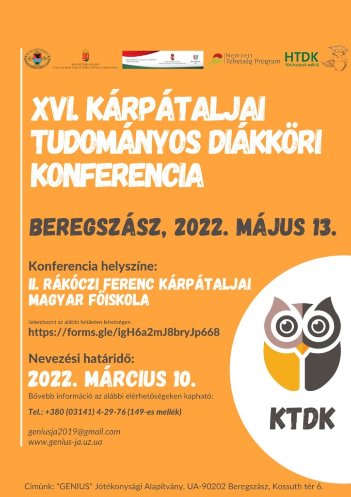A „GENIUS” Jótékonysági Alapítvány a II. Rákóczi Ferenc Kárpátaljai Magyar Főiskola, az Országos Tudományos Diákköri Tanács TDK Határok nélkül (HTDK) programjával együttműködve a Magyar Kormány, Miniszterelnökség Nemzetpolitikai Államtitkárság, Miniszterelnökség Családokért Felelős Tárca Nélküli Miniszter, a Nemzeti Tehetség Program és a Bethlen Gábor Alapkezelő Zrt. támogatásával meghirdeti a XVI. Kárpátaljai Tudományos Diákköri Konferenciát (XVI. KTDK).