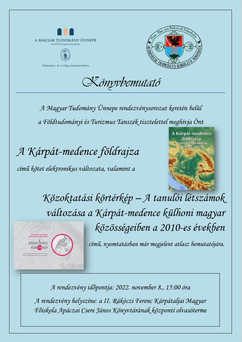 A II. Rákóczi Ferenc Kárpátaljai Magyar Főiskola Földtudományi és Turizmus Tanszéke a Magyar Tudomány Ünnepe rendezvénysorozat keretében 2022. november 8-án (kedden) 15 órai kezdettel könyvbemutatót rendez.