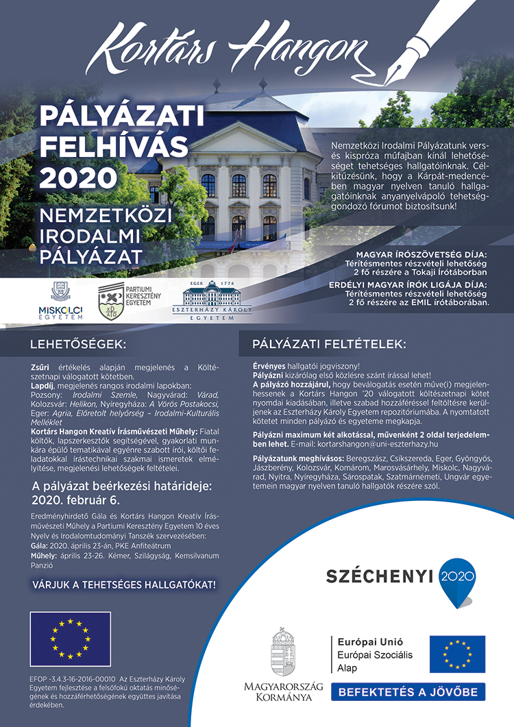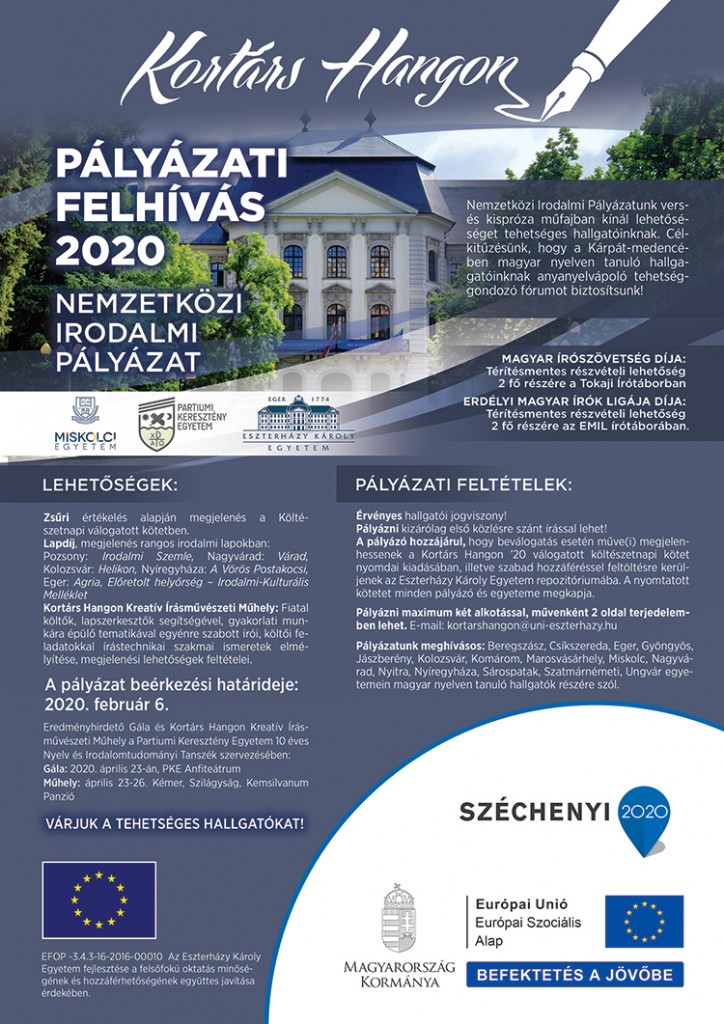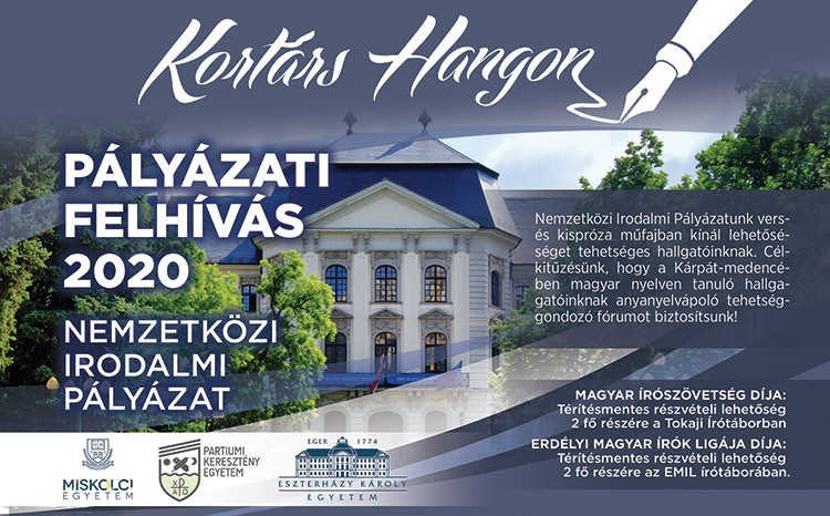 Az Eszterházy Károly Egyetem 16. éve szervezi – a Miskolci Egyetemmel közösen – a Kortárs Hangon Nemzetközi Irodalmi pályázatot. A magyar felsőoktatásban teljesen egyedül álló hallgatói tehetséggondozás elsődleges célkitűzése; a Kárpát-medencében magyar nyelven tanuló fiataloknak egyik fontos anyanyelvápoló fórumaként tudjon lehetőséget biztosítani tehetséges egyetemistáinknak. Az előző felhívásunkra 4 ország 14 egyetemi intézményéből 104 hallgató adta be pályázatát.