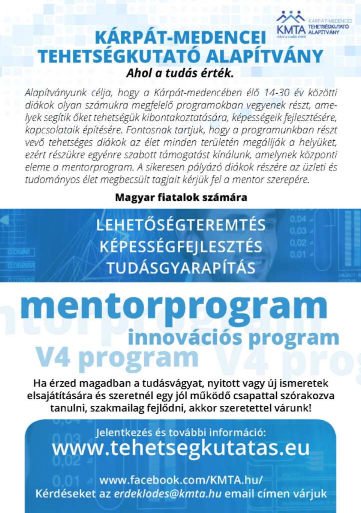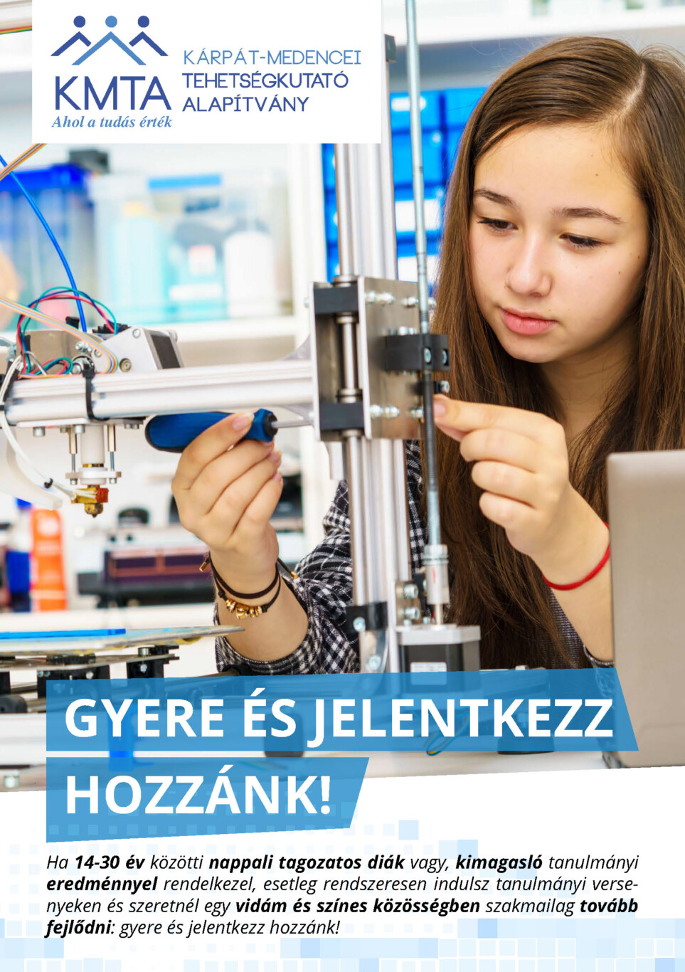 A Kárpát-medencei Tehetségkutató Alapítvány tehetségeket támogató programja első lépéseként várja olyan, Kárpát-medencei, kiemelkedő tehetségű, 14 és 30 év közötti, nappali tagozatos képzésben résztvevő fiatalok jelentkezését, akik: