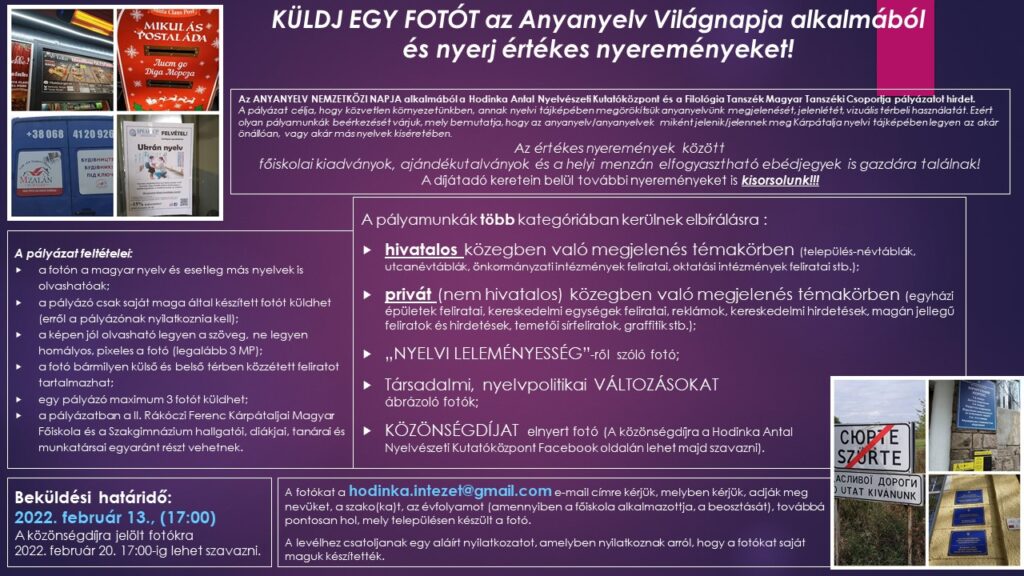Az ANYANYELV NEMZETKÖZI NAPJA alkalmából a Hodinka Antal Nyelvészeti Kutatóközpont és a Filológia Tanszék Magyar Tanszéki Csoportja pályázatot hirdet.