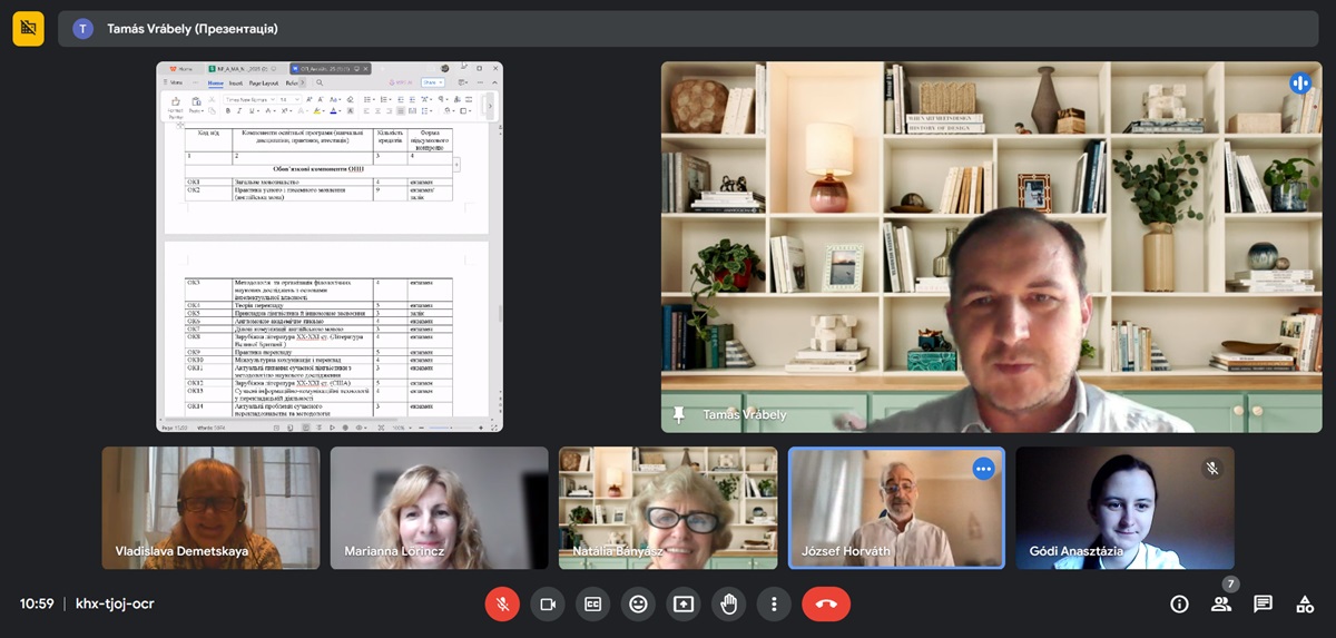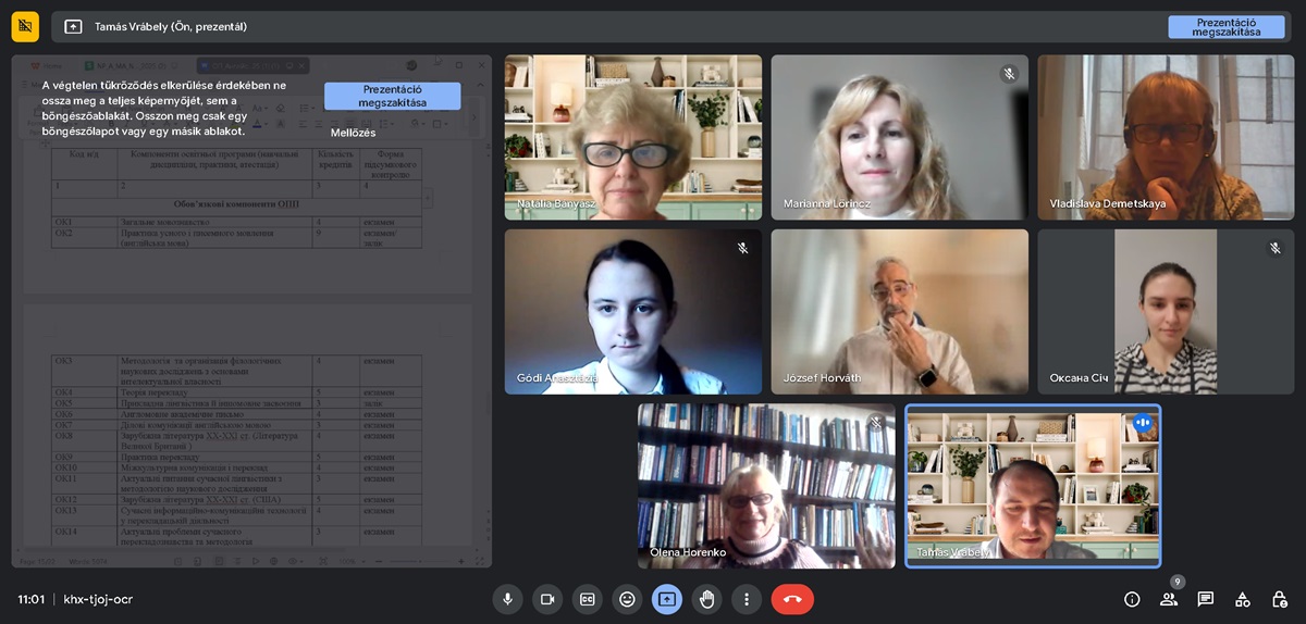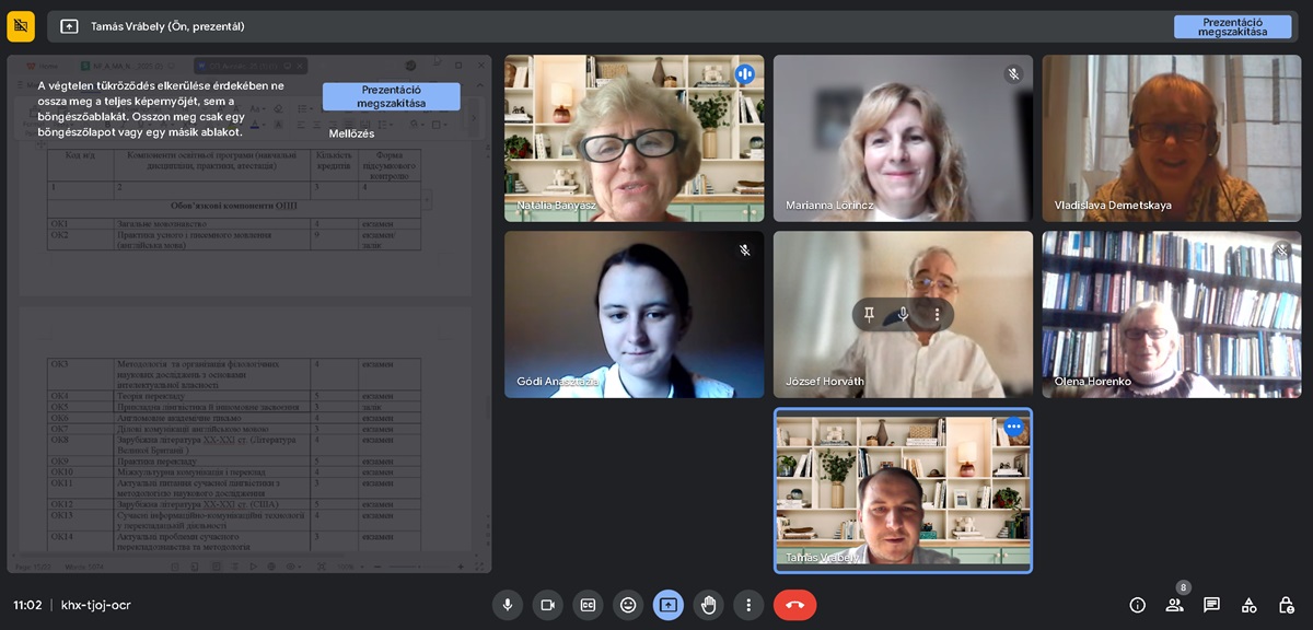 2024. március 13-án a 035-ös Filológia (angol nyelv és irodalom) mesterszak oktatási szintjén online találkozót tartott az oktatási-tudományos program projektcsoportja (az oktatási program szakfelelőse Vrábely Tamás, tagjai: Lőrincz Marianna és Demeckaya Vladiszlava professzorok, Horenko Olena és Bányász Natália, a Filológia Tanszék docensei, Gódi Anasztázia 1. évfolyamos mesterhallgató) és az érdekelt felek, hogy megvitassák az oktatási és tudományos program változásait.
