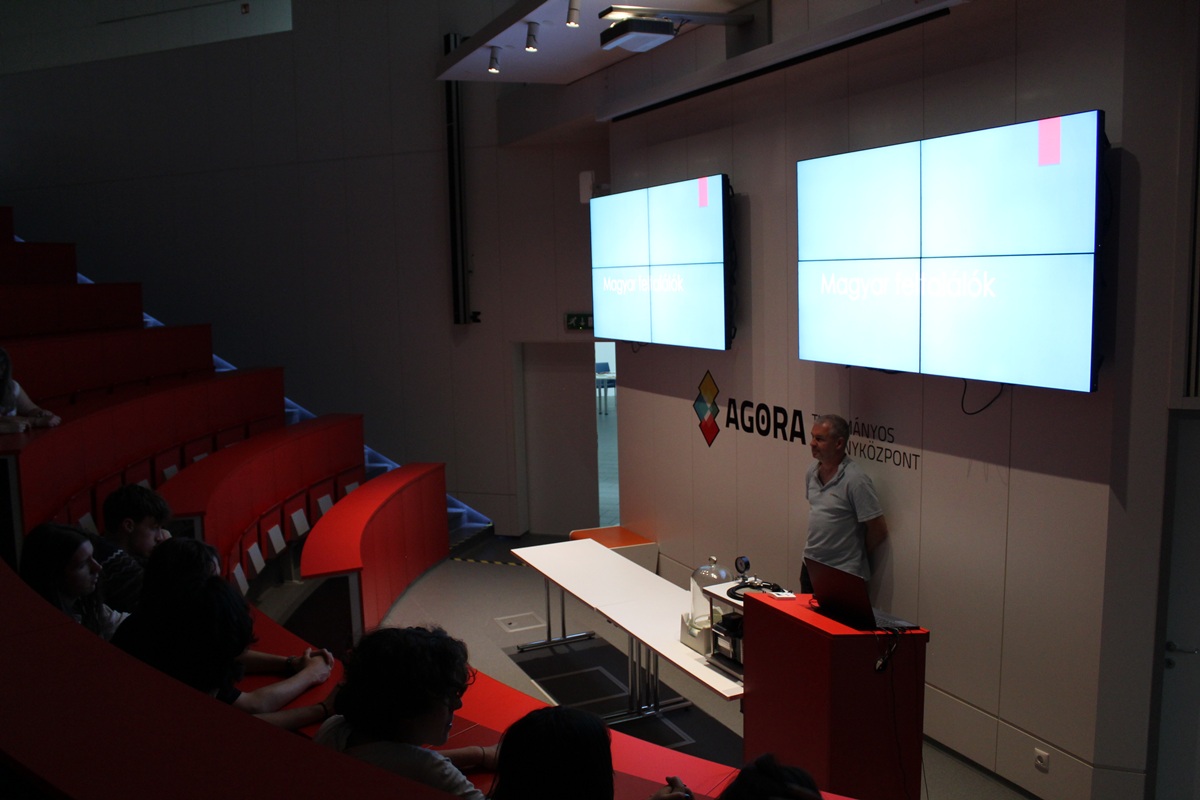 Ezt követően a hallgatók a debreceni HUN–REN Atommagkutató Intézetben (ATOMKI) tettek látogatást, ahol három izgalmas bemutatót hallgathattak meg. Dr. Király Beáta előadása a radioaktív sugárzások típusairól és mérésük módszertanáról nyújtott részletes képet. Dr. Molnár József, az ATOMKI műszaki igazgatója a pozitronemissziós tomográfia (PET) működését és gyakorlati alkalmazásait mutatta be. Dr. László Elemér előadása a radiokarbon (C14) kormeghatározási technikák elméleti és gyakorlati alapjait ismertette.