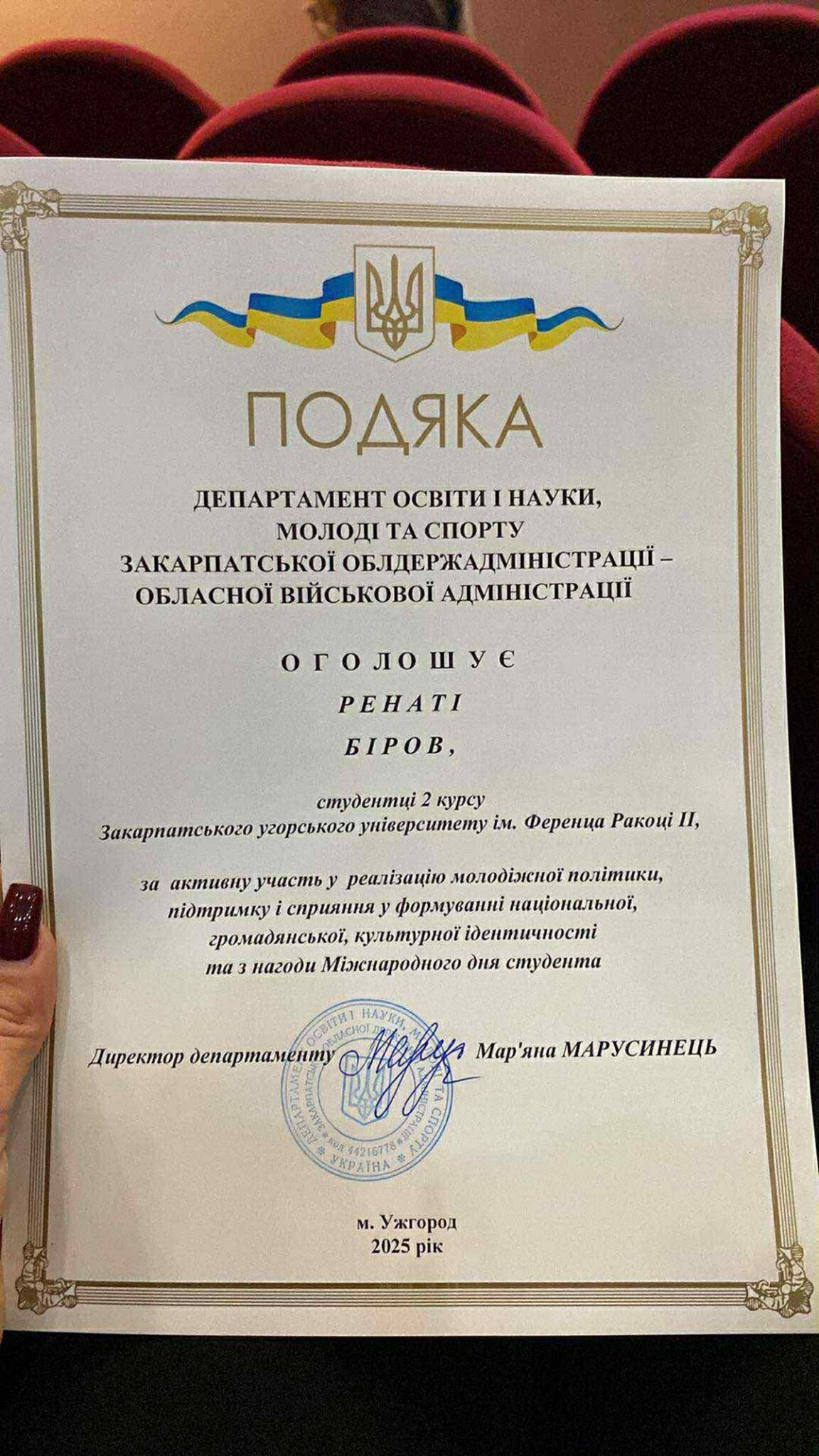 Maruszinec Marianna, a Kárpátaljai Megyei Katonai Adminisztráció Oktatási, Tudományos, Ifjúsági és Sportügyi Osztályának igazgatója 2025. november 17-én, a nemzetközi diáknap alkalmából tartott ünnepi rendezvényen oklevelekkel ismerte el a régió kiemelkedő teljesítményt nyújtó hallgatóit. A díjazottak között intézményünk négy hallgatója is szerepelt.