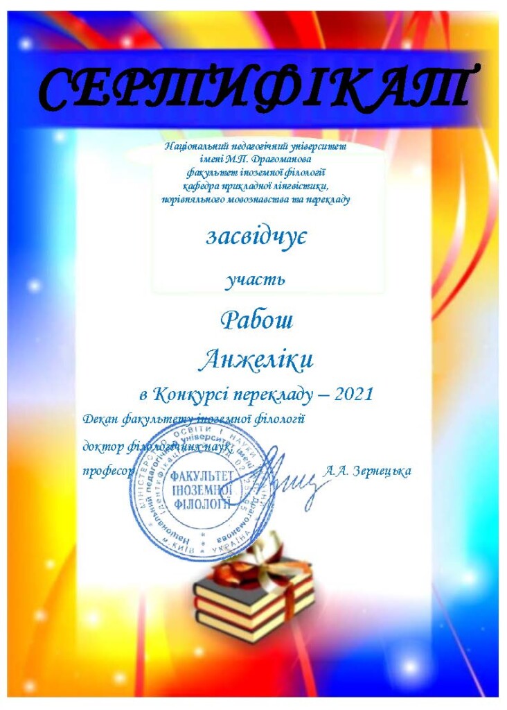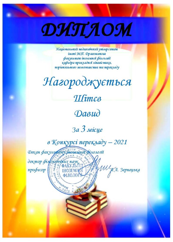 A Drahomanov Nemzeti Pedagógiai Egyetem idegen nyelvi bölcsészkarának alkalmazott nyelvészeti, összehasonlító nyelvészeti és fordítás tanszéke évente meghirdeti a nemzetközi diák fordítóversenyét.