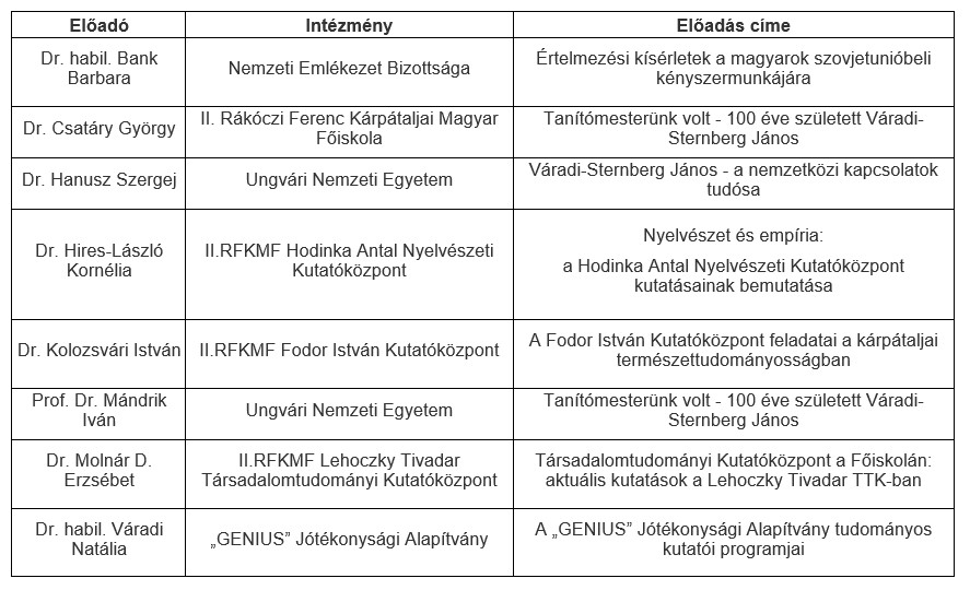 2023. november 10-én az előadások két szekcióban hangzottak el: Humántudományi és Reáltudományi Szekcióban. A 2 szekció munkáját összesen 24 elismert szakember segítette, akik 8 határon túli és kárpátaljai intézményből voltak jelen vagy csatlakoztak be a konferenciára.