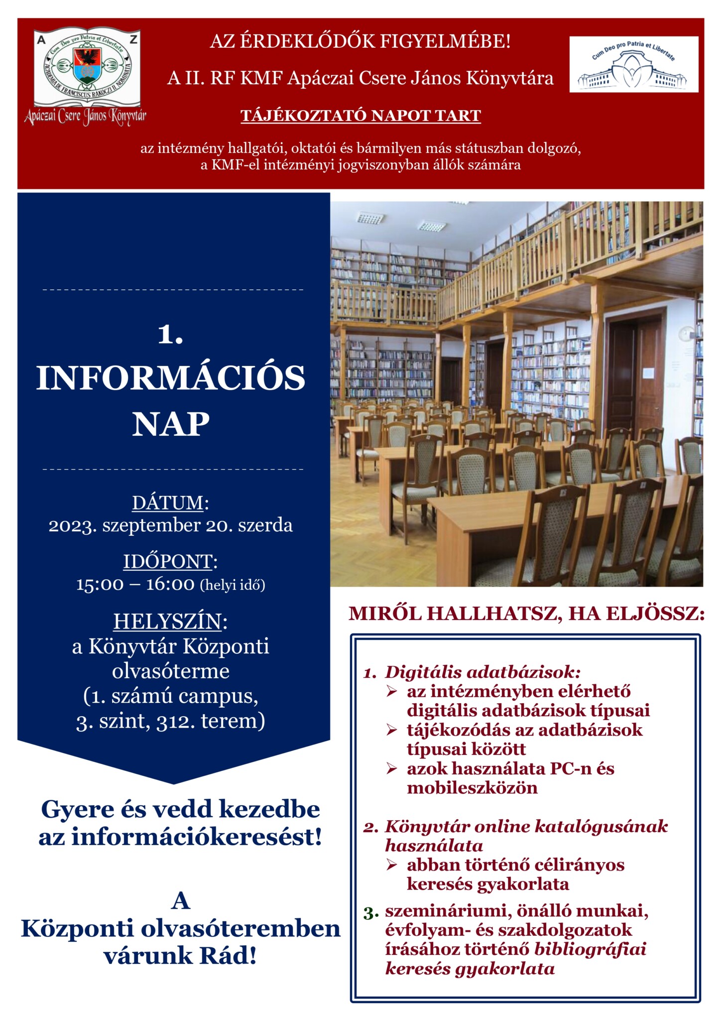 A tájékoztató napra 2023. szeptember 20-án (szerda) kerül sor, 15:00 – 16:00 között (helyi idő), melynek helyszíne a Könyvtár Központi olvasóterme (1. számú campus, 3. szint, 312. terem)