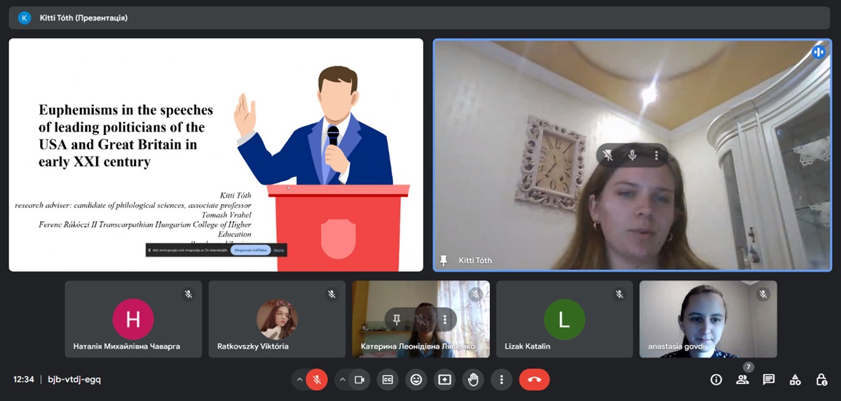A konferencia célja az elméleti és gyakorlati kutatási eredmények kölcsönös megismerése volt. A tudományos konferencia vegyes formában zajlott, amely lehetőséget biztosított ukrajnai és külföldi felsőoktatási intézmények fiatal kutatóinak, hogy bemutassák kutatási eredményeiket a különböző szekciókban. Számos aktuális kérdést megvitattak. Érdekes és informatív előadásokat tartottak a II. RF KMF Filológia Tanszékének alap- és mesterképzésben tanuló hallgatói. Tóth Kitti első éves magiszteri képzésben tanuló angol szakos hallgató Eufemizmusok az Egyesült Államok és Nagy-Britannia vezető politikusainak beszédeiben a 21. században c. témában adott elő, amely nagy érdeklődést, illetve élénk vitát váltott ki a hallgatóság körében.