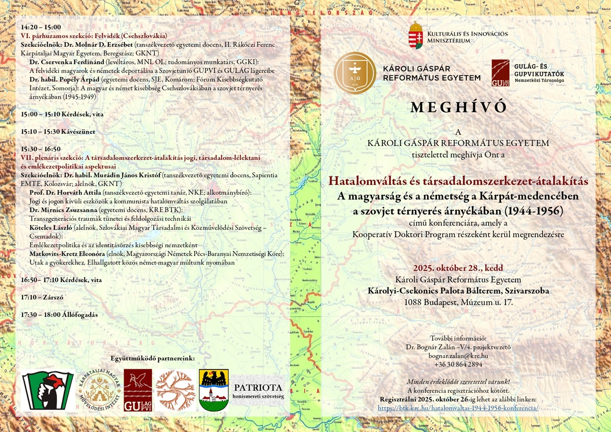A Károli Gáspár Református Egyetem adott otthont a Hatalomváltás és társadalomszerkezet-átalakítás – A magyarság és a németség a Kárpát-medencében a szovjet térnyerés árnyékában (1944–1956) című nemzetközi tudományos konferenciának. A rendezvényt Szuhi Róbert rektorhelyettes nyitotta meg prof. dr. Trócsányi László, az egyetem rektorának nevében. A konferencia célja, hogy tudományos igénnyel feltárja a II. világháborút követő évek Kárpát-medencei hatalmi és társadalmi átalakulásait, különös tekintettel a magyarságot és németséget sújtó kollektív bűnösség politikájára.