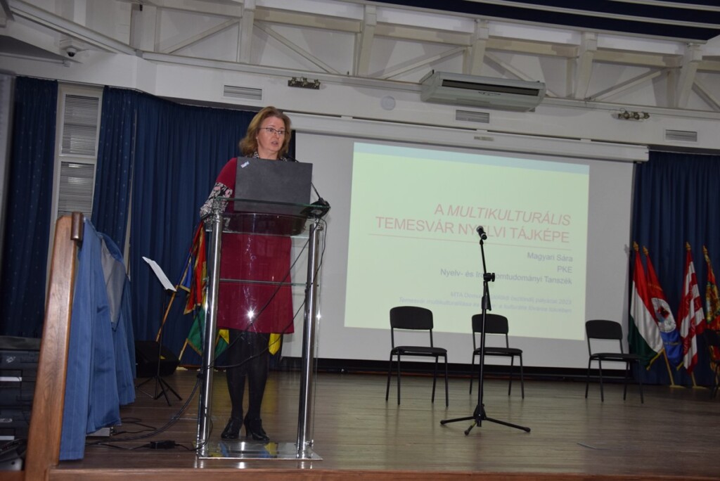 Ezt követően Magyari Sára, nyelvész, a Partiumi Keresztény Egyetem tanára Temesvár multikulturalitása és fénye – a kulturális főváros tükrében című előadását tekinthettük meg. A bemutatóban a tanárnő elkalauzolta a jelenlévőket Temesvárra, a legek városába. Megismerhettük azt a sokszínű, multikulturális várost, amely ebben az évben Európa Kulturális Fővárosa címet viseli. Nyelvi tájképeken keresztül láthattuk, hogyan is jelennek meg a többnyelvű (magyar) felíratok, hogyan is éli meg kisebbségi létét a magyar közösség Romániában. Egy másik közösség, egy másik ország, de mégis, mintha kicsit magunkra, kárpátaljaiakra ismerhettünk volna.