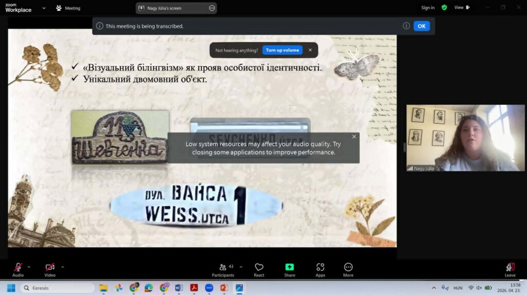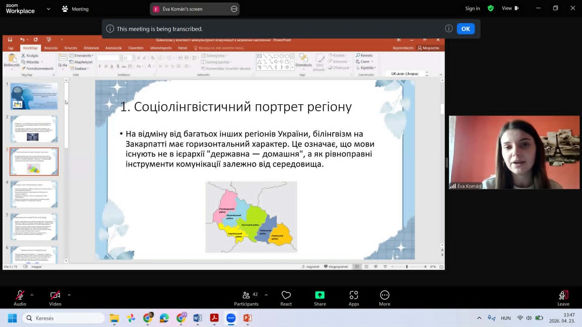 A plenáris előadók között szerepeltek Komári Éva és Nagy Júlia mesterszakos filológus hallgatóink. Komári Éva előadásának címe Kétnyelvűség az interkulturális kommunikáció kontextusában Kárpátalja lakosságának nyelvhasználatában, míg Nagy Júlia előadásának címe Az ukrán–magyar kétnyelvűség vizuális reprezentációja a Beregszászi járás nyelvi tájképében (Feketeardó, Csepe és Forgolány község példáján).