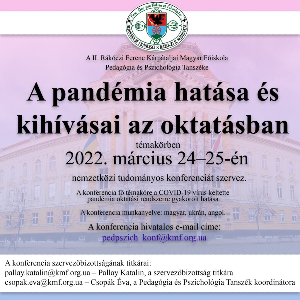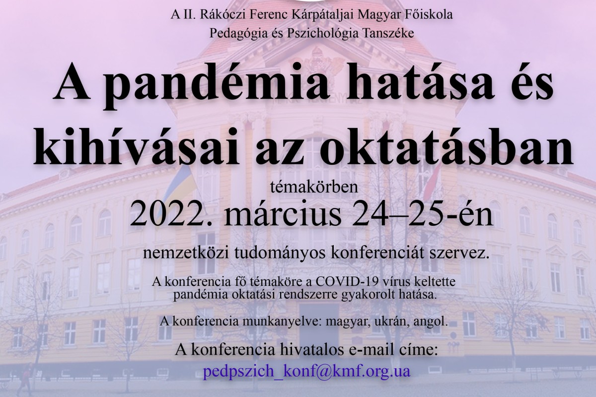 A II. Rákóczi Ferenc Kárpátaljai Magyar Főiskola Pedagógia és Pszichológia Tanszéke A pandémia hatása és kihívásai az oktatásban témakörben 2022. március 24–25-én nemzetközi tudományos konferenciát szervez.