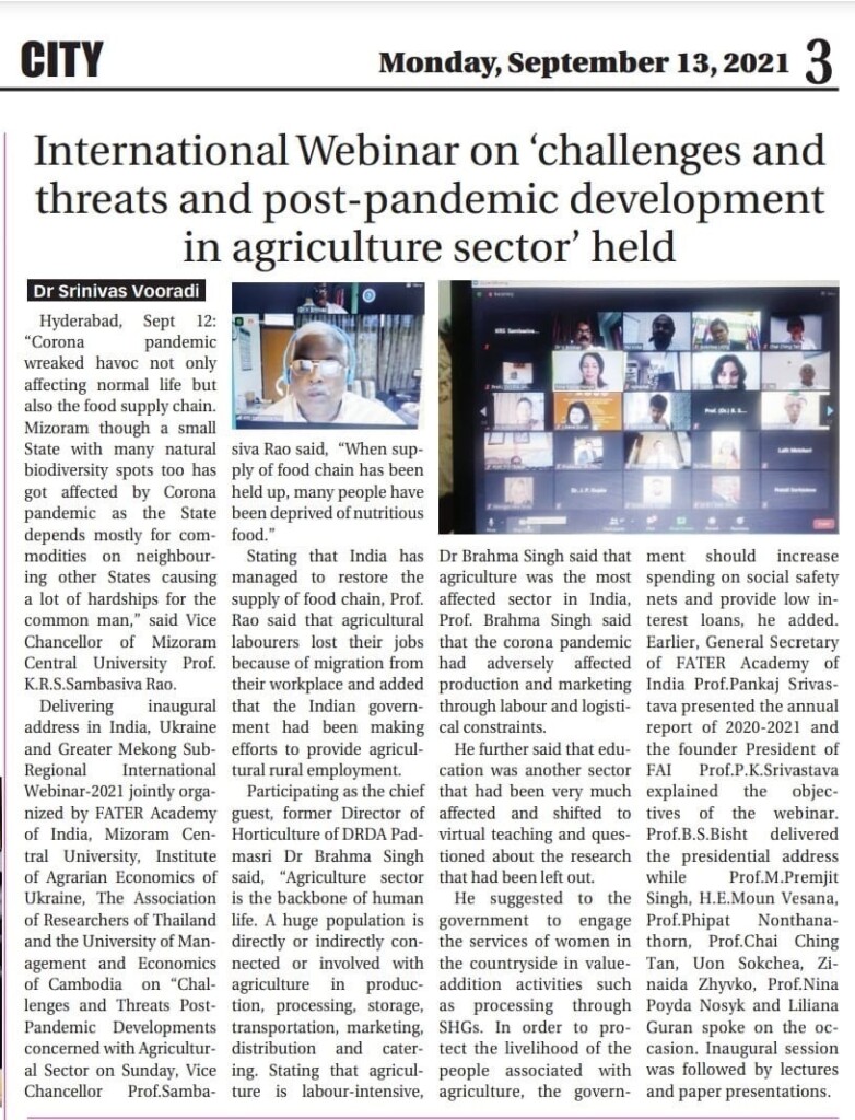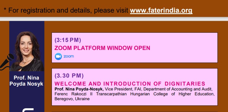 A webinárium megnyitójának és az előadók beszédeinek moderátora a Számvitel és Auditálás Tanszék professzora Prof. Dr. Pojda-Noszik Nina, akit nemrég a FATER Academy of India (FAI) alelnökévé választottak. A webinárium az agrárszektor járványfejlődését követő kihívásokra és fenyegetésekre összpontosított.