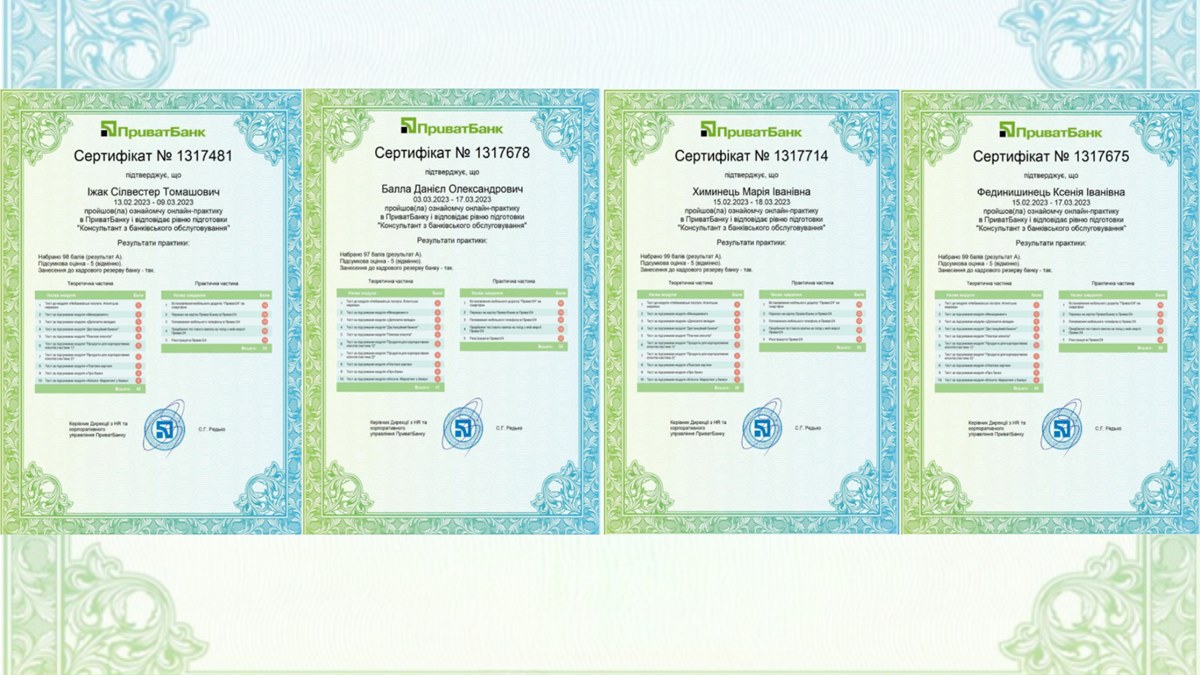 Ez fontos része a tanulási folyamatnak, mivel lehetővé teszi a diákok számára, hogy megszerezzék a szükséges gyakorlati készségeket és tapasztalatokat, amelyek hasznosak lesznek a jövőbeli karrierjükben. Az érdekes és hasznos gyakorlati képzés segít a hallgatóknak megismerkedniük a megszerzett elméleti ismeretek gyakorlati alkalmazásával. A sikeres gyakorlati képzés után a diákok elismerő oklevelet kaptak, amely igazolja képzettségi szintjüket. A hallgatók továbbá elhelyezkedési lehetőséget kapnak a Privat Banknál, és a legjobbakat besorolják a bank várólistájába.
