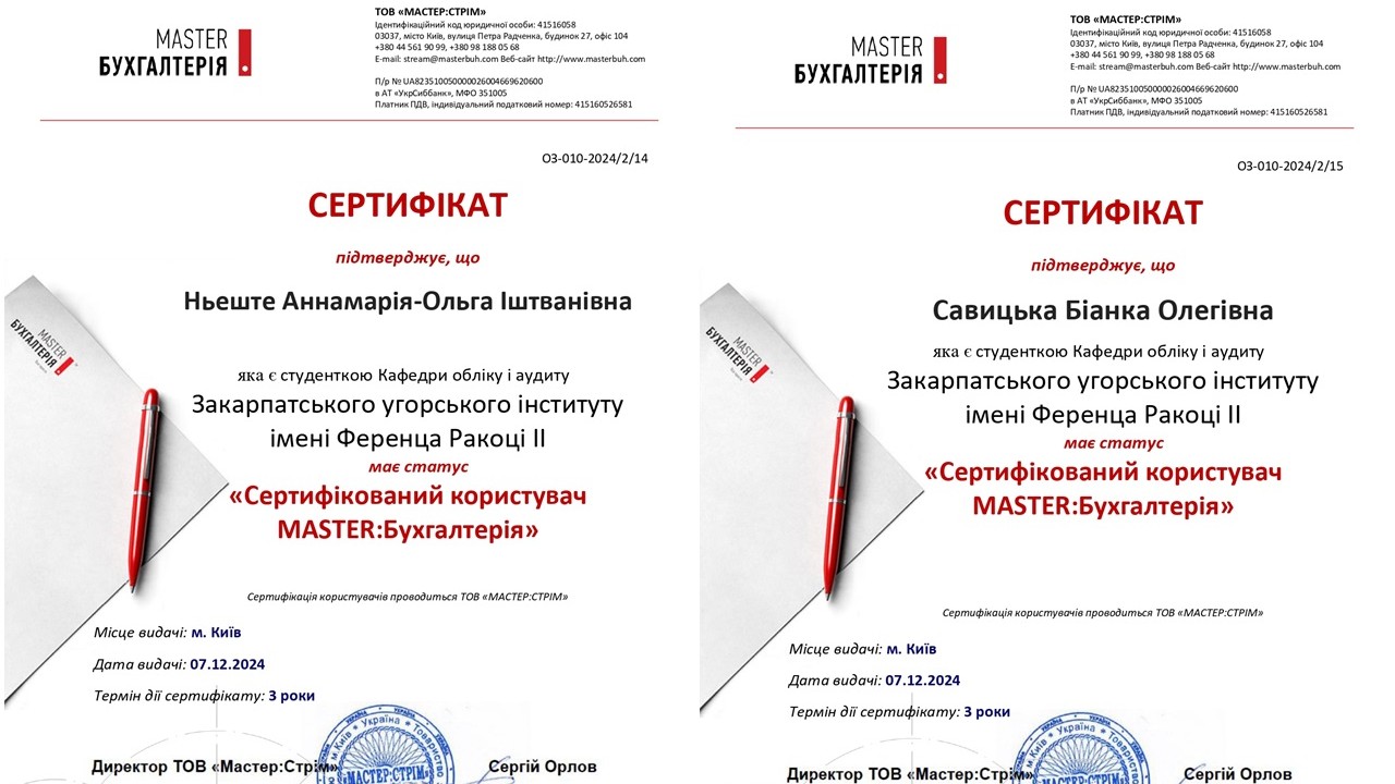 A képzés eredményeként a legkiválóbb hallgatók – Szavicka Bianka, Farkas Flóra-Magdolna és Nyeste Anna-Mária – tanúsítványokat kaptak, amelyek igazolják a MASTER: Számvitel minősített felhasználó státuszukat. Ez a program versenyképesebbé teszi a végzősöket a munkaerőpiacon, és lehetőséget nyújt számukra, hogy a megszerzett tudást sikeresen alkalmazzák a gyakorlatban.