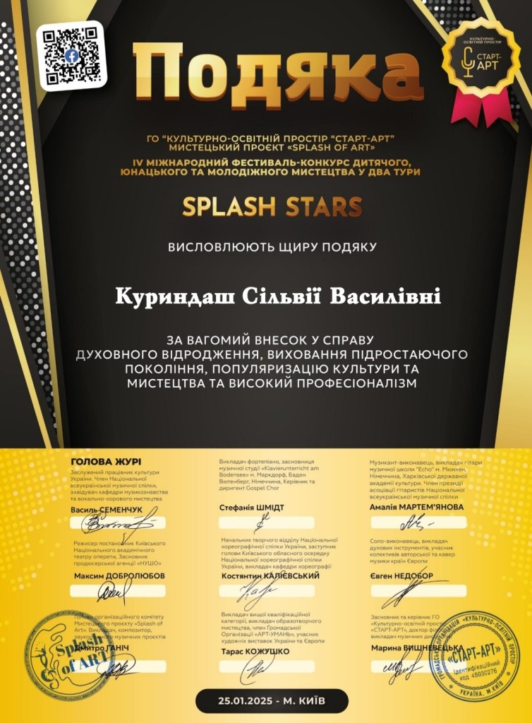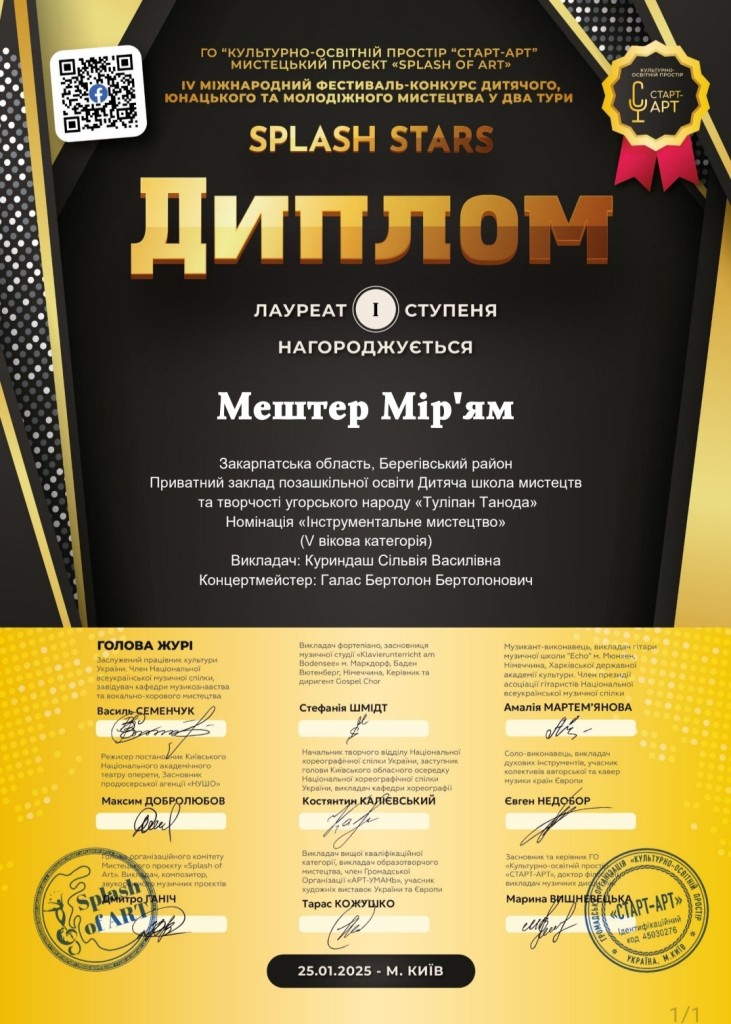 A „Start-art” művészeti projekt keretében a „SPLASH STARS” IV. Nemzetközi Ifjúsági és Gyermekművészeti Verseny második fordulójában Mester Mirjám cimbalmos növendékünk első helyezést ért el népi hangszeres szóló kategóriában. Felkészítő tanára: Kurendás Szilvia, a Tulipán Tanoda cimbalmos oktatója, koncertmester: Halász Bertalan (harmonika).