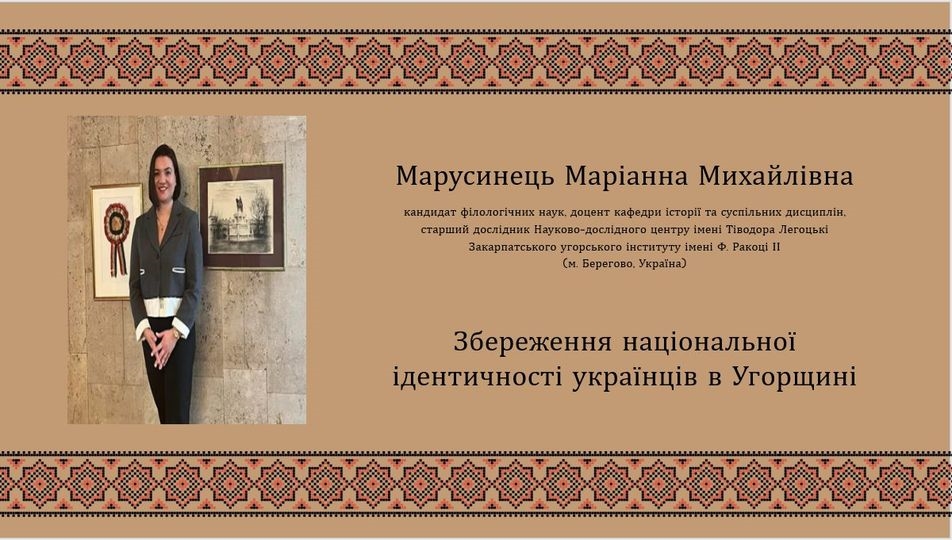 A plenáris ülés résztvevői számára A magyarországi ukránok nemzeti identitásának megőrzése címmel Maruszinec Marianna, a filológiai tudományok kandidátusa, a II. Rákóczi Ferenc Kárpátaljai Magyar Főiskola Történelem- és Társadalomtudományi Tanszékének docense, a Lehoczky Tivadar Társadalomtudományi Kutatóközpont tudományos főmunkatársa adott elő.