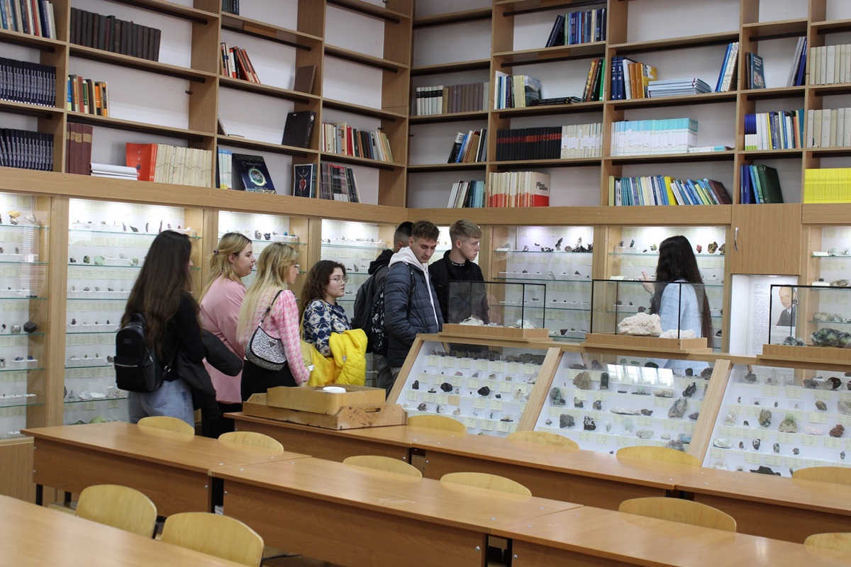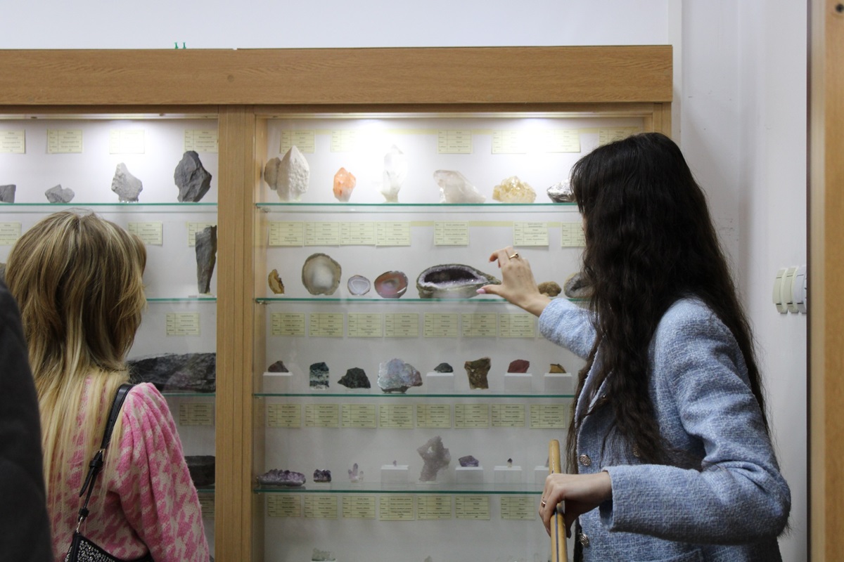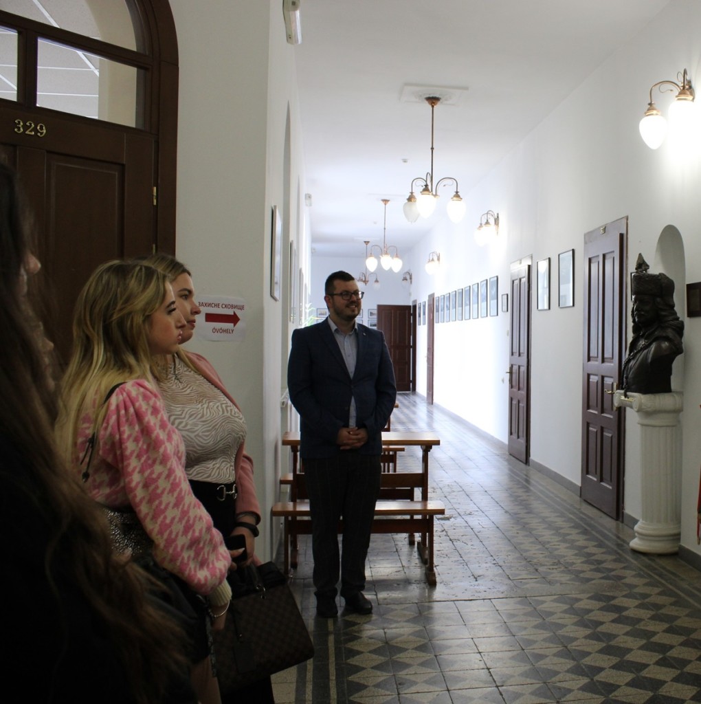 Az idegenvezetés a főiskola alapításának történelmi áttekintésével kezdődött, majd ezt követően bemutatták a fontosabb részlegeket, kiállításokat, termeket. A 3. emeleten megtekintettük az Esztergom termet (ez az egyik rendezvényterem), a Barkáts Jenő Ásványtárat és az Apáczai Csere János Könyvtár központi olvasótermét. Az idegenvezetés a 4. emeleten folytatódott, ahol a kárpátaljai népművészet egy részét, a beregi szőttest, illetve különböző népviseleteket és hagyományos népi tárgyakat mutattak be.