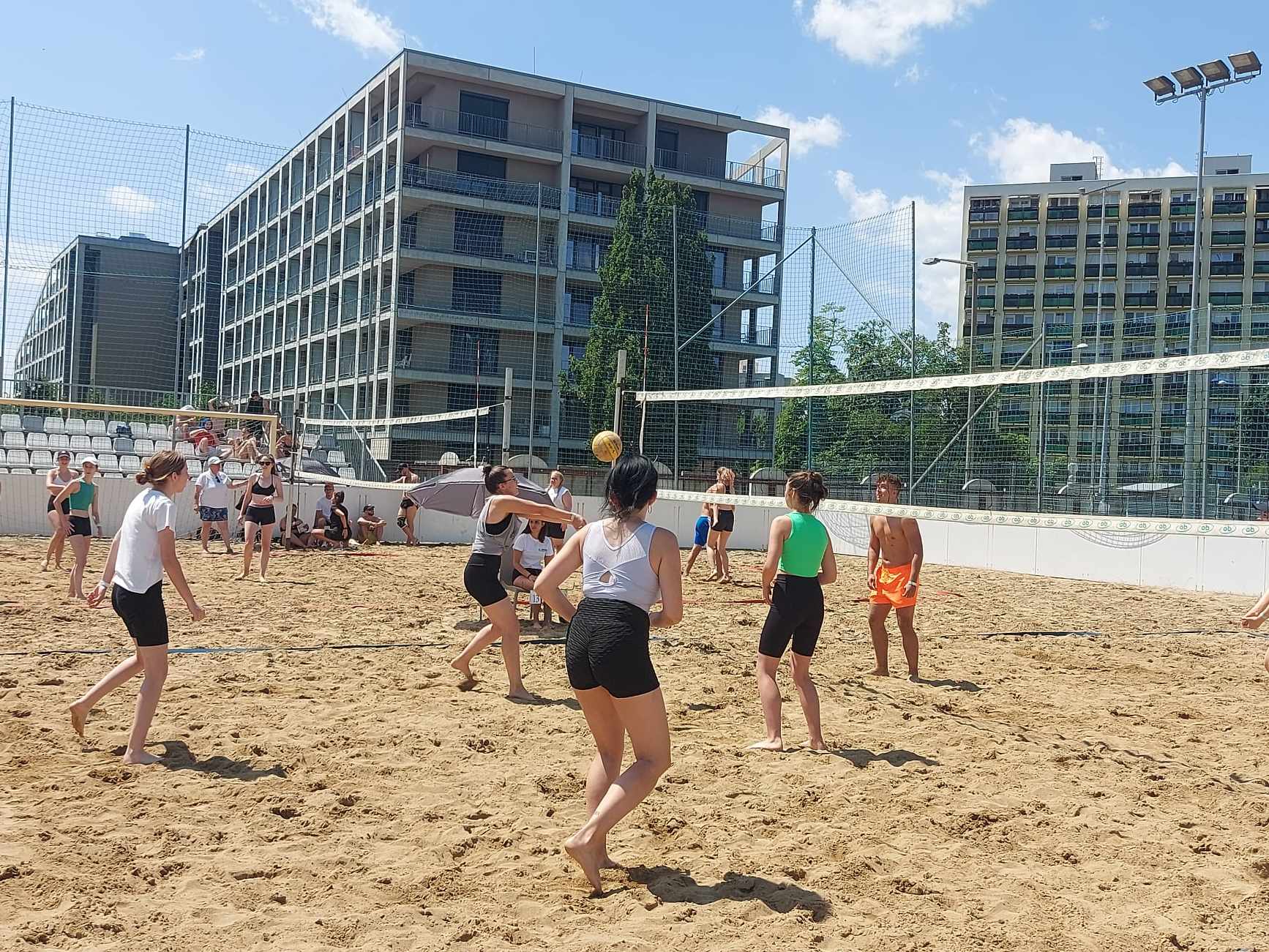 Főiskolánk az összes sportágban állított ki csapatot (kivétel a férfi 3×3 kosárlabda) kisebb-nagyobb nehézségek árán, mivel a vegyes összeállítású strandröplabdán csak lányaink játszottak, foci csapatunk kapushiánnyal küszködött, kosaras csapatunk is az utolsó pillanatig számtalanszor változott a „röpi” csapatba való megbetegedett hallgató helyett való átigazolás miatt. Ennek ellenére meglepően sikeresen meneteltek előre csapataink az egyes kieséses szakaszokban. Idén a legnépszerűbb sportágnak a strandröplabda mutatkozott, ahol összesen 82 csapat regisztrált és vett részt. A szervezők 4 illetve 5-ös csoportok kialakításával bonyolították le megmérettetéseket, ahonnan a 4-es összeállításból az első az 5-ösökből pedig a legjobb kettő juthatott tovább. Csapatunk saját 4-es csoportjából a második helyen végzett, így a továbbjutás számunkra sajnos nem sikerült. A 3×3 női kosárlabda csapatunk kiemelkedően remekül szerepelt. A két napon át tartó megmérettetések sora folyamán a körmérkőzések szoros és kiélezett küzdelmei eredményeként a szinte összes 12 egyesületi csapatok közül a megérdemelt hatodik helyet szerezték meg lányaink. Ez komoly teljesítmény, hiszen versenyképes csapatokkal kellett szembenézniük. A kispályás labdarúgás terén is nagyon kemény küzdelmeket vívtak fiaink, hiszen 50 regisztrált csapat közül a saját csoportjukban a második helyen végeztek. A továbbjutásuknak köszönhetően a következő fordulóban a meccset magabiztos és magas fölénnyel megnyerve biztosították az előre menetelüket a 16-os elődöntőbe. A soron következő mérkőzés csapatunk számára sajnos kedvezőtlen párosítást hozott, mivel a bajnokság nyertes Corvinus csapatával méretettek össze. Igaz fiaink vereséget szenvedtek, viszont méltóan küzdöttek és bebizonyították, hogy az élen járó csapatok ellen is felveszik a küzdelmet. A bajnokságot követően a szórakozás és a kikapcsolódás következett a régió legnagyobb zenei fesztiválján.