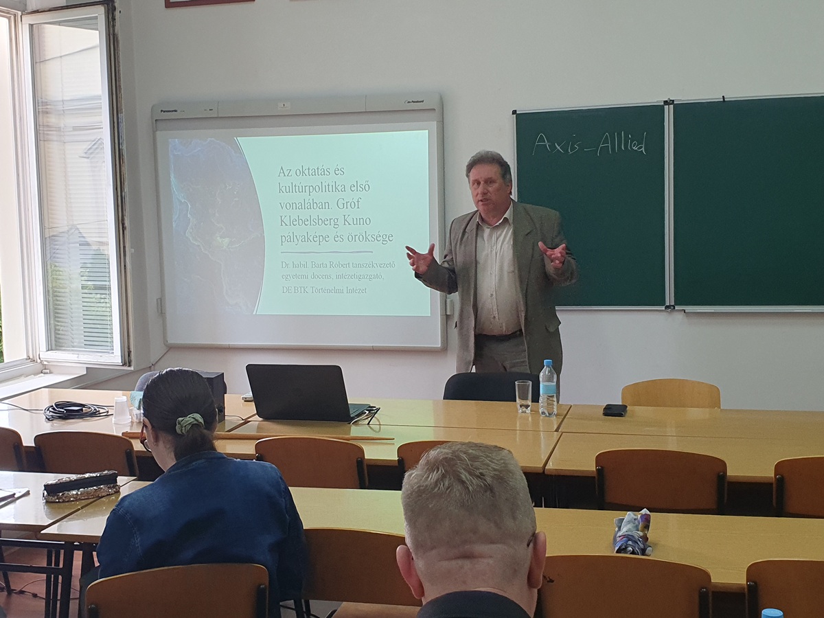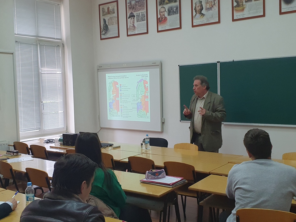 Vendégoktatónk az alap- és a mesterképzésen tanuló történelem szakos hallgatók számára tartott előadásokat, melyeknek köszönhetően a hallgatók megismerkedhettek a második világháború vitás kérdéseivel, továbbá betekintést nyerhettek gróf Klebelsberg Kunó életpályájába.