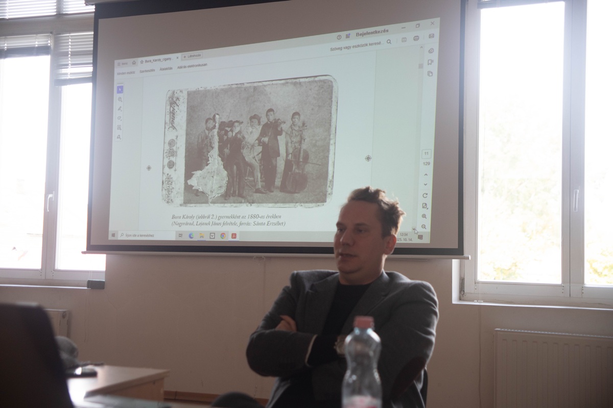 Előadása második felében dr. Hajnáczky Tamás Bura Károly cigányprímás életútját mutatta be. Megtudhattuk, hogy Bura Károly a 19. század végén Debrecenben született, zenészcsaládban. A család később Nagyváradra költözött, ahol a fiatal Károly viszonylag korán megkezdte saját prímási karrierjét. Az első világháború alatt Bura Károly a nagyváradi hadtestnél szolgált, zenekart alapított. Trianon után Nagyváradon egy magyar rendezvényen nyilvánosan eljátszotta a magyar himnuszt, amiért a román titkosrendőrség letartóztatta. Kolozsvárra vitték, bebörtönözték, majd végül váltságdíjért engedték el. Ezután Budapestre költözött, ahol Horthy Miklós kormányzó személyes prímása lett. Ő volt az első, aki egy jövőbeli Roma Múzeum létrehozásának szükségességét fogalmazta meg.