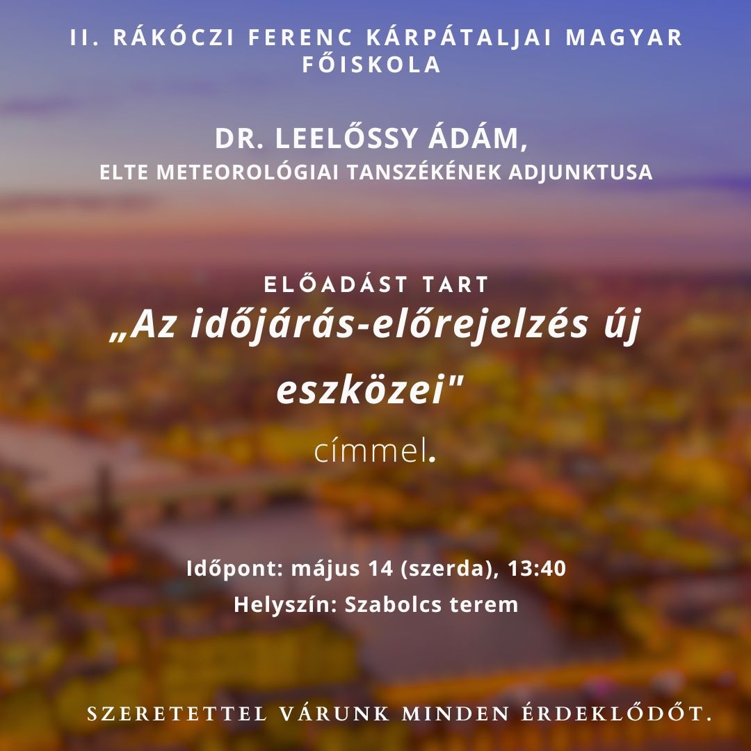 A II. Rákóczi Ferenc Kárpátaljai Magyar Főiskola Szabolcs termében előadást tart dr. Leelőssy Ádám, az ELTE Meteorológiai Tanszékének adjunktusa.