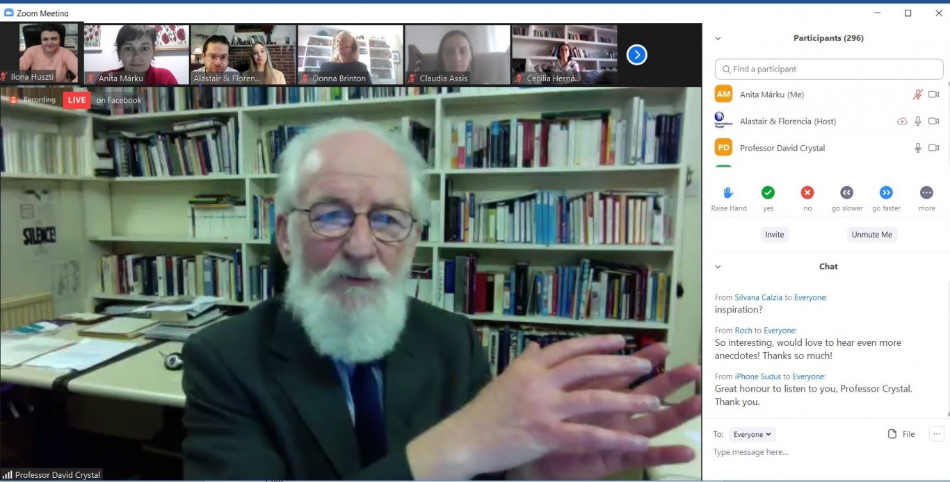 Az október 18-i interjújuknak különleges vendége volt: David Crystal nyelvészprofesszort kérdezték legújabb könyvének (Crystal, D. (2020). Let’s talk: How English conversation works. Oxford: Oxford University Press) megjelenése apropóján. A professzor úr wales-i otthonából köszöntötte a Zoom interjút élőben hallgató 300 résztvevőt a világ minden tájáról, többek között Kárpátaljáról is (Márku Anita nyelvész és Huszti Ilona nyelvpedagógus). Bárki tehetett fel kérdést a professzor úrnak, melyet a házigazdák tolmácsoltak, ő pedig szívesen válaszolt.