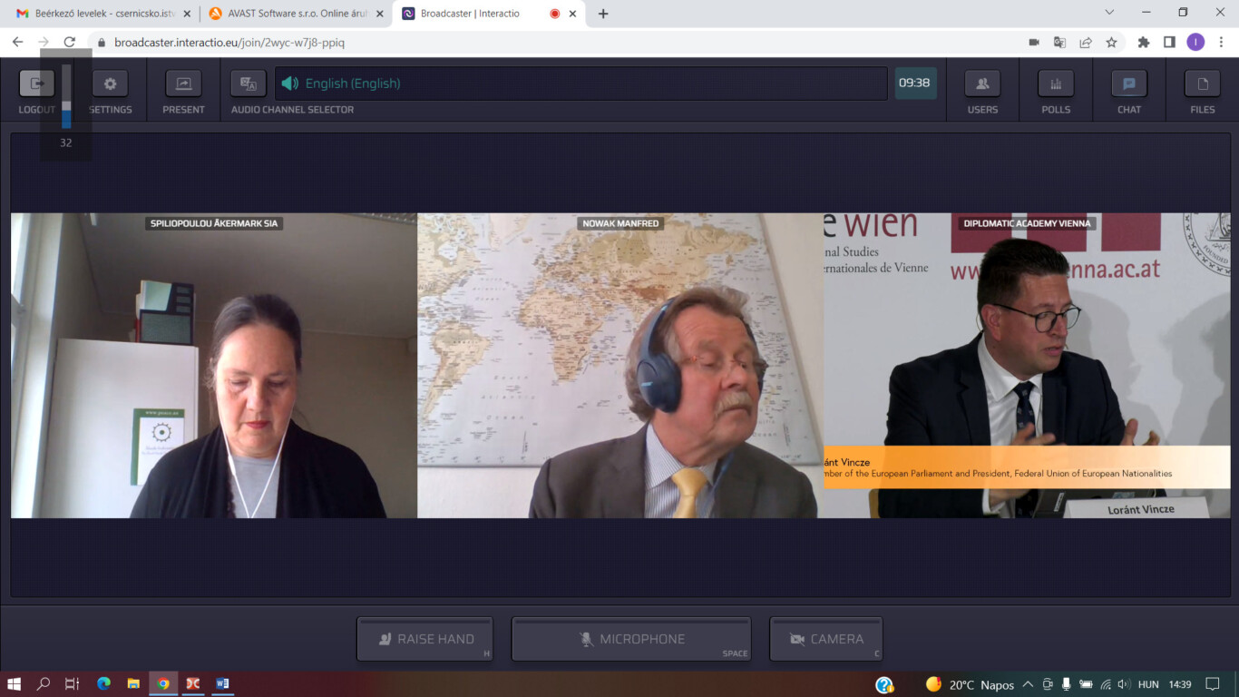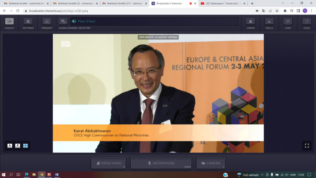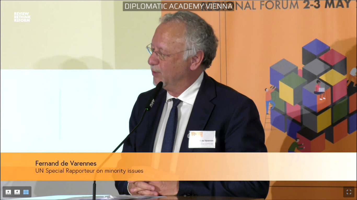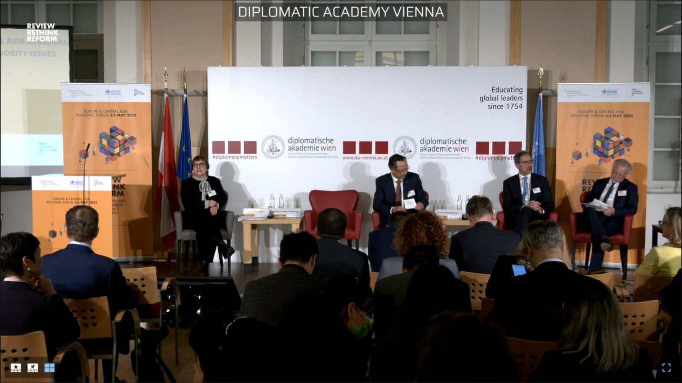 Május 2-3-án került sor Bécsben az Európa – Közép-Ázsia Regionális Fórumra, melynek központi témája a kisebbségek kérdése volt. A személyes, illetve online részvétellel zajló eseményen előadóként részt vett például Kairat Abdrakhmanov, az EBESZ kisebbségi főbiztosa, Fernand de Varennes, az ENSZ kisebbségi különleges jelentéstevője, Vincze Lóránt, a FUEN elnöke, Biró Annamária, a Tom Lantos Intézet igazgatója, Michael O’Flaherty, az Európai Unió Alapjogok Ügynökségének vezetője, vagy éppen Arno Kompatscher, a Bolzano/Bozen központú területi autonómia kormányzója.