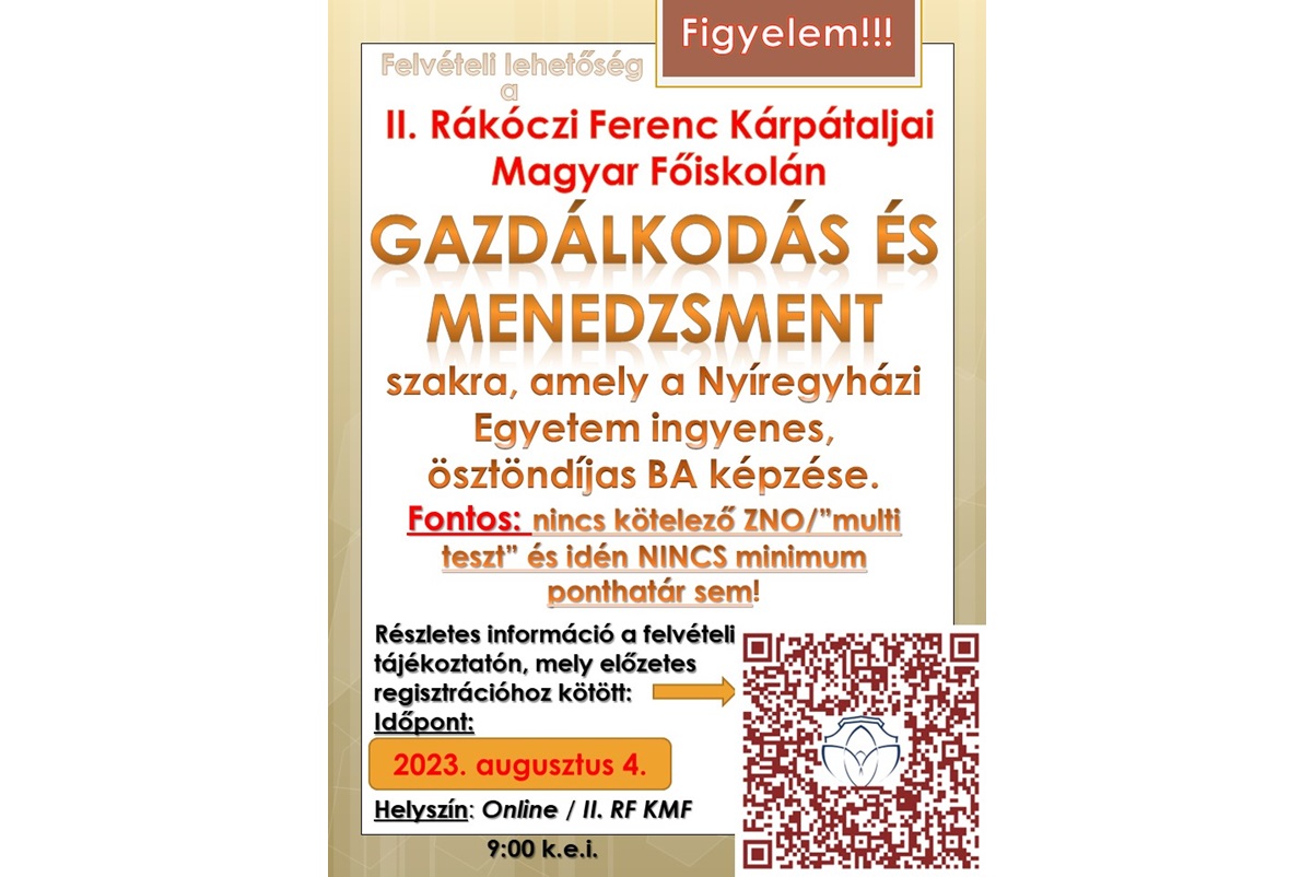 A felvételi tájékoztatón részletes információt kaphatnak, s feltehetik egyedi kérdéseiket mindazok, akik a helyszínen (Beregszász, Kossuth tér 6.), vagy online formában kívánnak részt venni. Akik ukrajnai lakcímmel jelentkeznek, de jelenleg Magyarországon tartózkodnak, jelenléti formában a Nyíregyházi Egyetemen (Nyíregyháza, Sóstói út 31/B) is részt vehetnek a tájékoztatón. A részvétel előzetes regisztrációhoz kötött, mely elérhető az alábbi linken, vagy QR kód beolvasása segítségével.