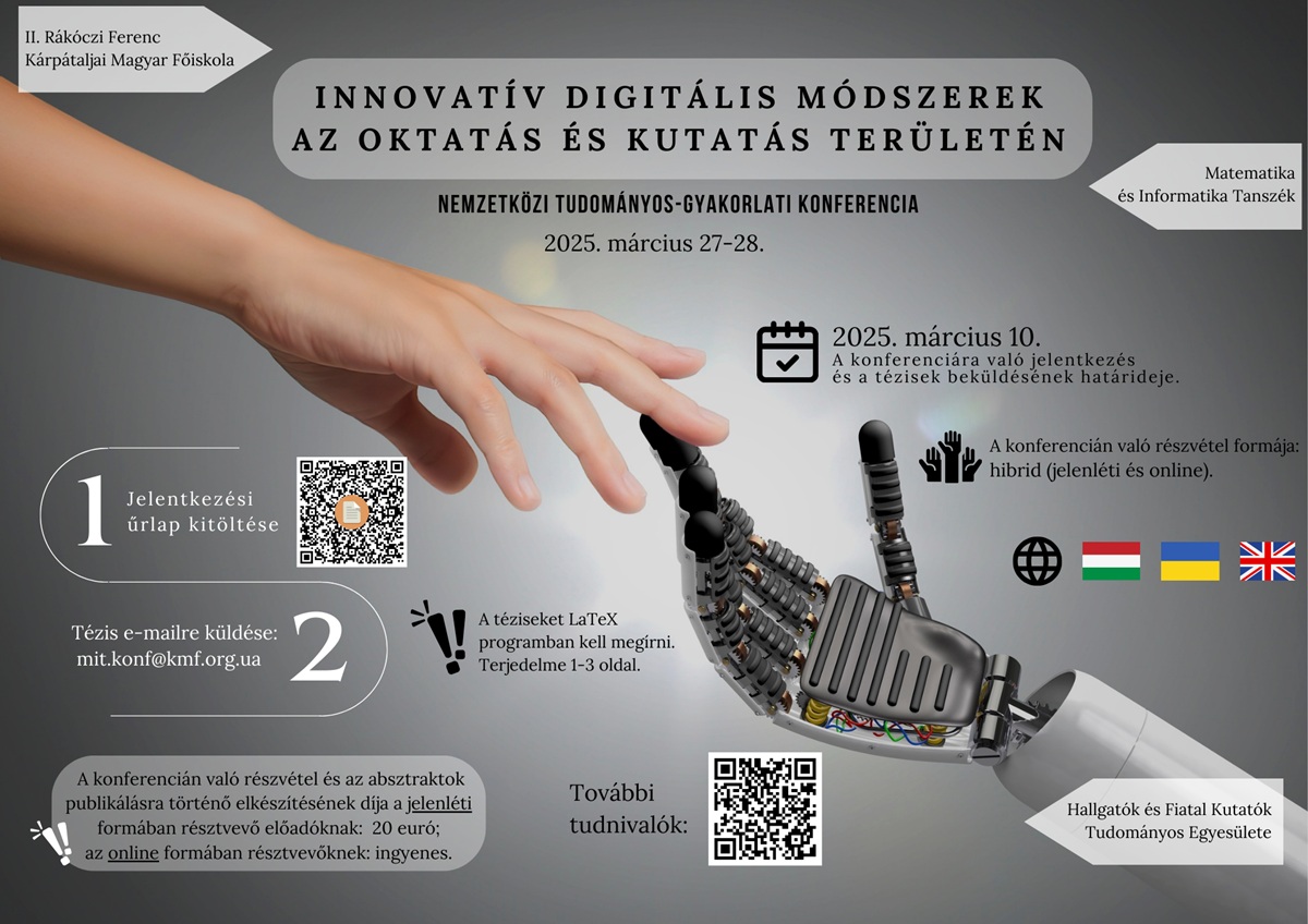 A II. Rákóczi Ferenc Kárpátaljai Magyar Főiskola, a Matematika és Informatika Tanszék, valamint a Hallgatók és Fiatal Kutatók Tudományos Egyesülete a Rákóczi Napok apropójából nemzetközi tudományos-gyakorlati konferenciát szervez Innovatív digitális módszerek az oktatás és kutatás területén címmel.