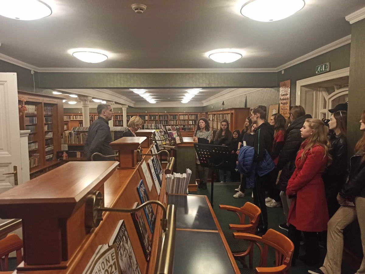 A magyarországi nyilvános szakkönyvtárak közül ez az egyik legfiatalabb intézmény, amely nemcsak irodalmi és nyelvészeti tárgyú dokumentumokat gyűjt, hanem zeneműtárként is szolgál. Nagyon népszerű a hallgatók körében, hiszen itt rengeteg szakirodalmi forrás megtalálható egyéni kutatásaikhoz. A tárlatvezető rövid történelmi betekintést nyújtott a könyvtár megalakulásának történetébe, majd elkalauzolta a hallgatókat a különböző részlegekbe. Így megtekinthették az olvasótermet, a folyóirat-olvasót, a szabadpolcos könyvkiválasztó teret, a számítógépparkot és a nyelvstúdiót. Ez utóbbi nagyon értékes, főként idegen nyelvet tanulóknak. A hallgatók számára rendkívül érdekesnek bizonyult a zeneműtár is, hiszen itt a zenehallgatás mellett interaktív zongorázási lehetőség is rendelkezésre áll. Ezt követően a hallgatók megtekinthették a könyvtár legértékesebb és legrégebbi idegen nyelvű kiadványait.