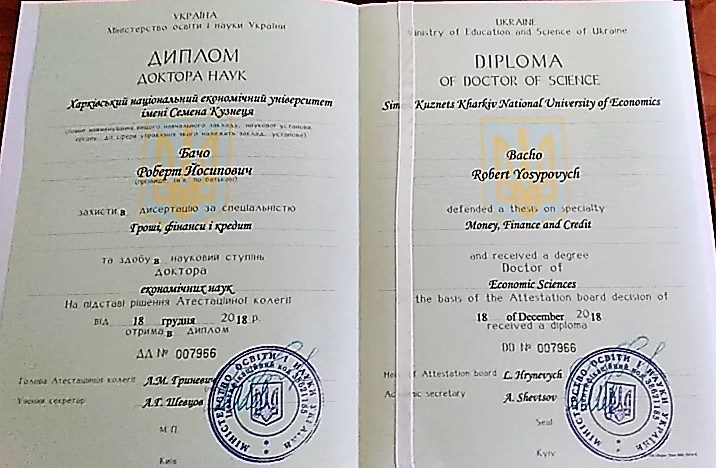 2018. december 18-án Ukrajna Oktatási és Tudományos Minisztériuma jóváhagyta dr. Bacsó Róbert tudományos munkáját, és odaítélte számára a gazdálkodástudományi nagydoktori fokozatot.