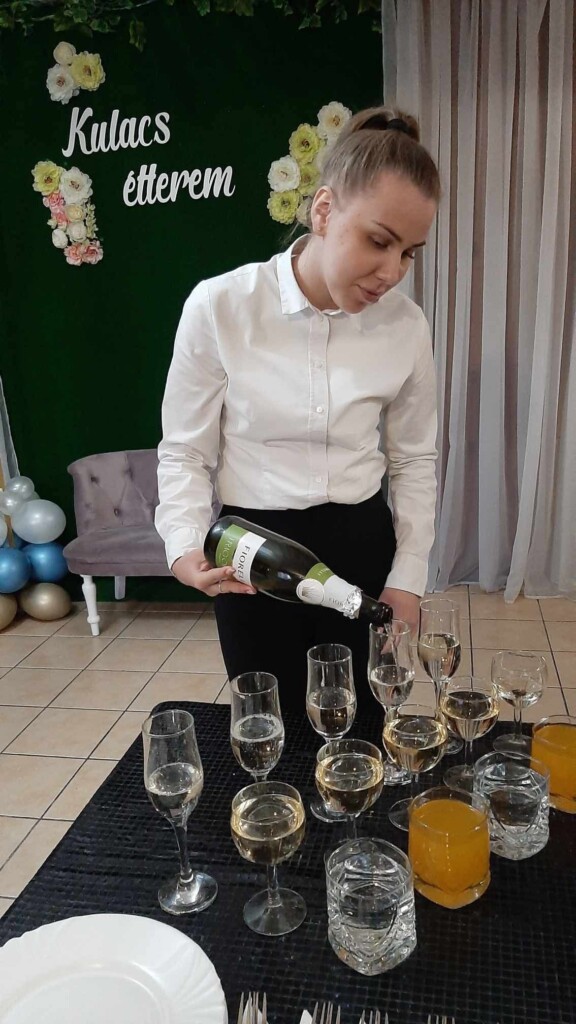 A gyakorlat második szakaszában az italszerviz, a szalvétahajtogatás és az asztalterítés került előtérbe. A tantárgy oktatója elmagyarázta a bor és a pezsgő szakszerű felbontásának és felszolgálásának lépéseit, mely munkafolyamatokat a hallgatók a magyarázatnak megfelelően saját maguk végezhették el. Ezt követően a szalvétahajtogatás módszereibe is betekintést nyertek a hallgatók, ahol egyszerű, mégis elegáns formák összeállítását gyakorolták. A program zárásaként a hallgatóknak egy előzőleg megtervezett menüsor alapján, önállóan kellett megteríteniük egy asztalt – ez a feladat nemcsak figyelmet és precizitást igényelt, hanem lehetőséget is adott arra, hogy megmutassák, mit tanultak a nap folyamán, és hogyan tudják az elméleti ismeretanyagot kreatív ötleteikkel és saját ízlésükkel kiegészíteni.