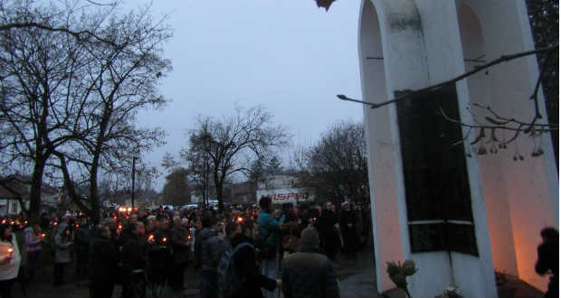 A templomban összegyűlt fiatalok és idősek felolvasták az áldozatok neveit, majd a menetben jelképesen egy-egy áldozat gyertyáját vitték, és helyezték el az emlékműnél.