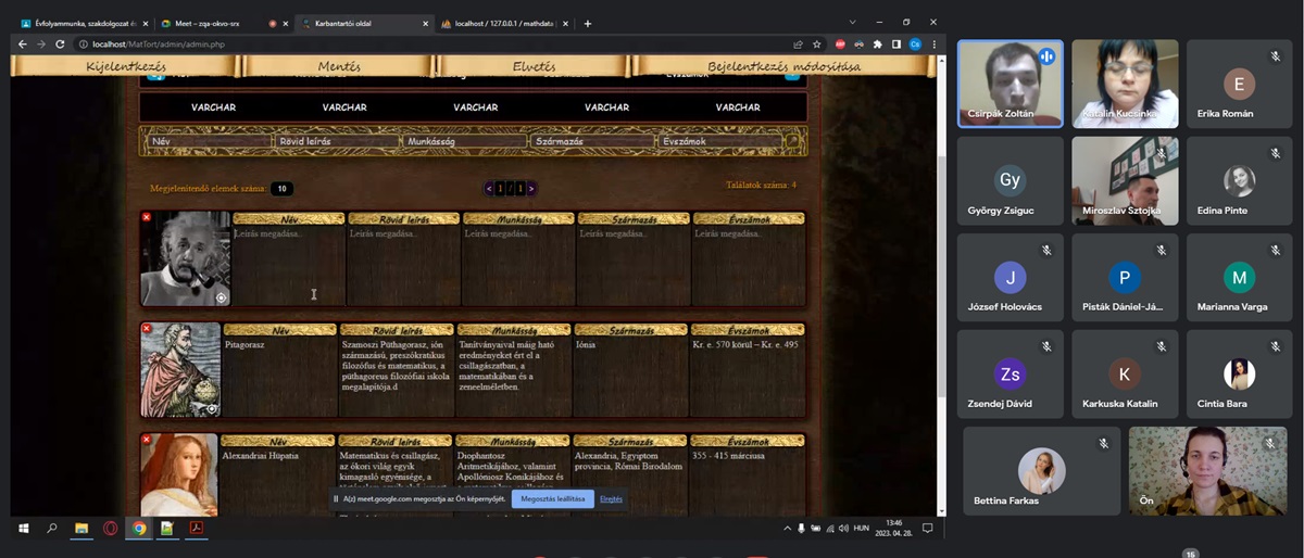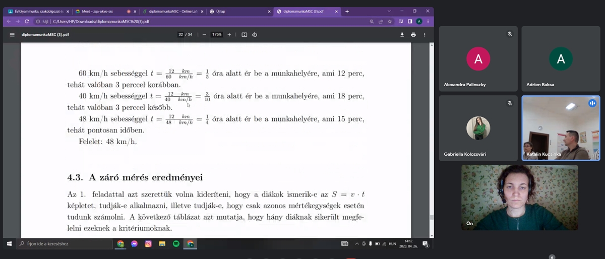 Az elmúlt héten a Matematika és Informatika Tanszék Középiskolai Oktatás (Matematika) BSc szintű és Középiskolai Oktatás MSc szintű képzési programjaiban résztvevő hallgatók mutatták be évfolyammunkáikban, szakdolgozataikban, illetve diplomamunkáikban elvégzett munkafolyamat jelenlegi állást.